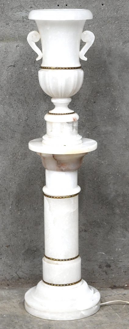 A bronze pendant lamp with an alabaster bowl and three rose-shaped glass candle holders.No longer availableDim. Hoogte 70, Ø 45 cmEstimate: € 80 / 120 -
