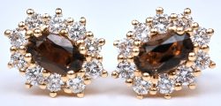 #145Een paar 18 kt geelgouden oorbellen bezet met briljanten met een gezamenlik gewicht van +- 0,20 ct. en bruine saffier met een gezamenlijk gewicht van +- 0,44 ct.