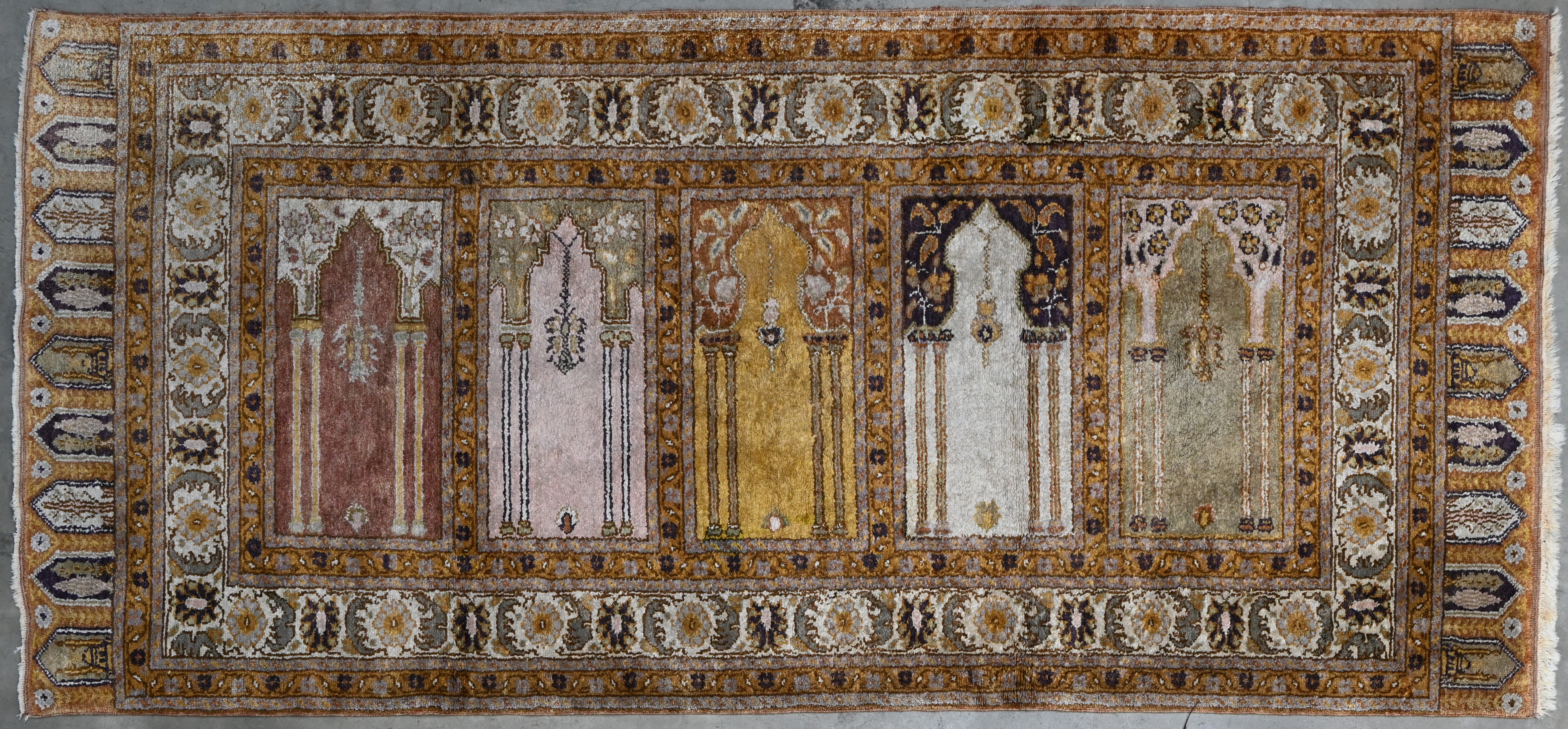 Een Anatolische wollen Saf-loper versierd met vijf mirhabs.
