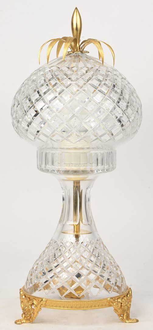 A pineapple-shaped table lamp, of colorless VSL crystal. On a gold-colored metal base. Unmarked.