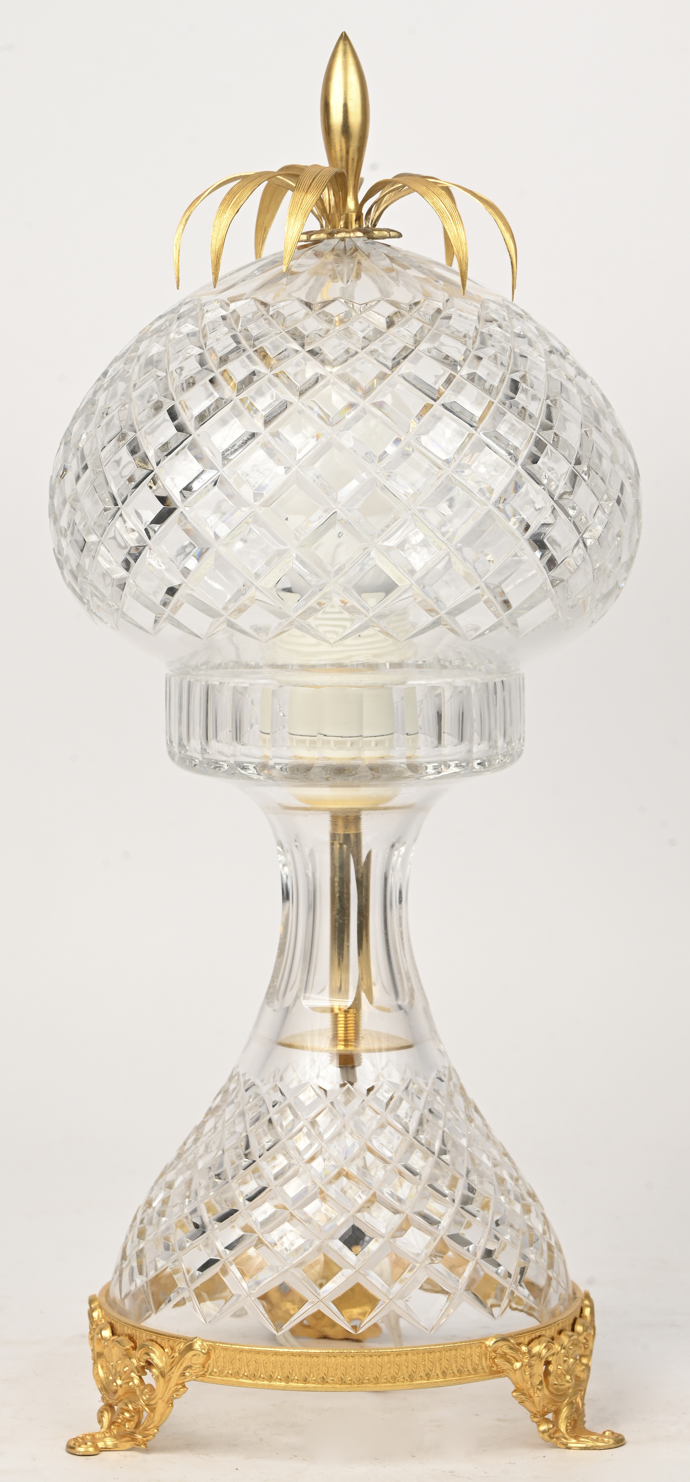 Een ananasvormige tafellamp, van kleurloos kristal. Op een goudkleurige metalen voet. Niet gemerkt.