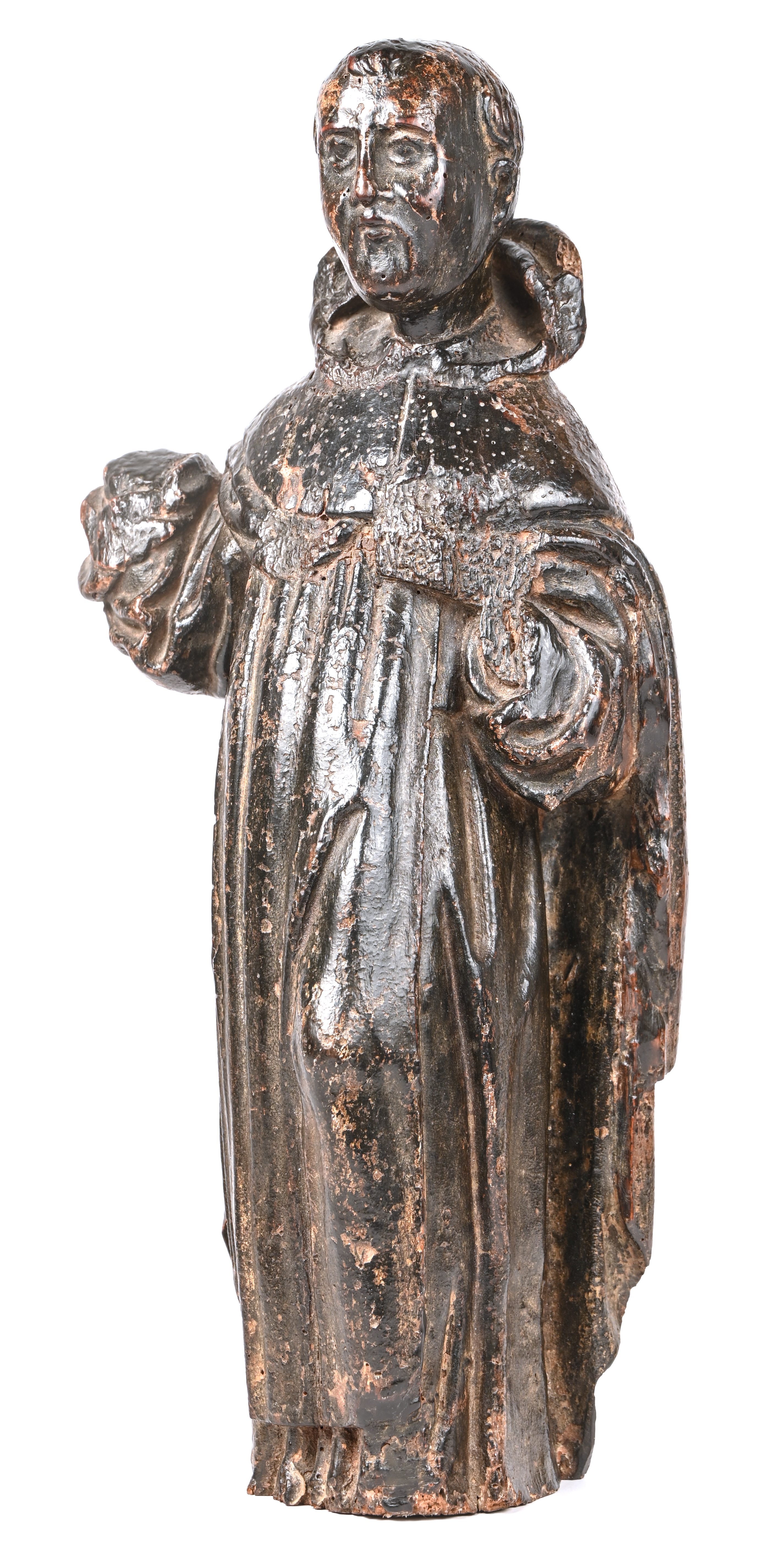 Een antiek houten beeldje van een pater. Zwart gepatineerd, de handen zijn manco. Vermoedelijk 18e eeuw.