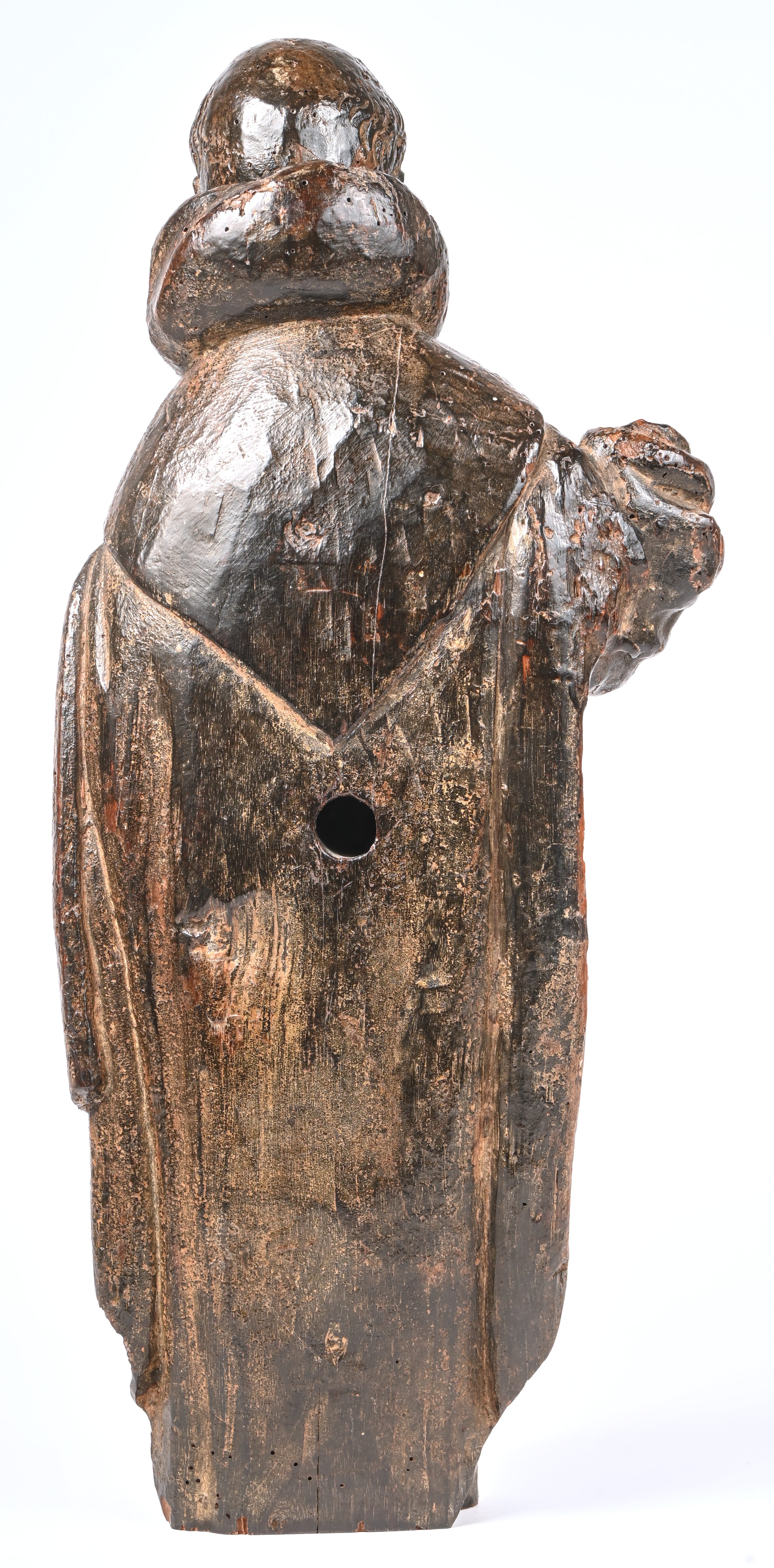An antique wooden figurine of a friar. Black patina, the hands are missing. Probably 18th century.