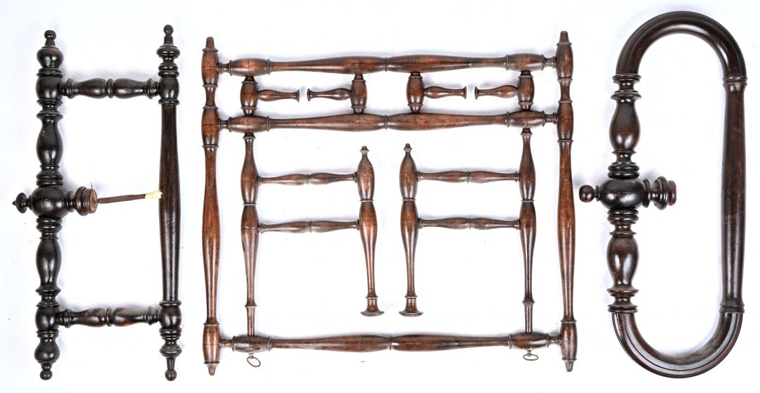 An antique wooden collapsible coat rack, accompanied by 2 old wooden towel racks.