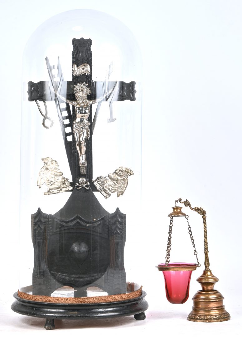 A 19th-century icon depicting numerous saints. In the center, an Orthodox bronze cross with an Old Russian text on the back. -