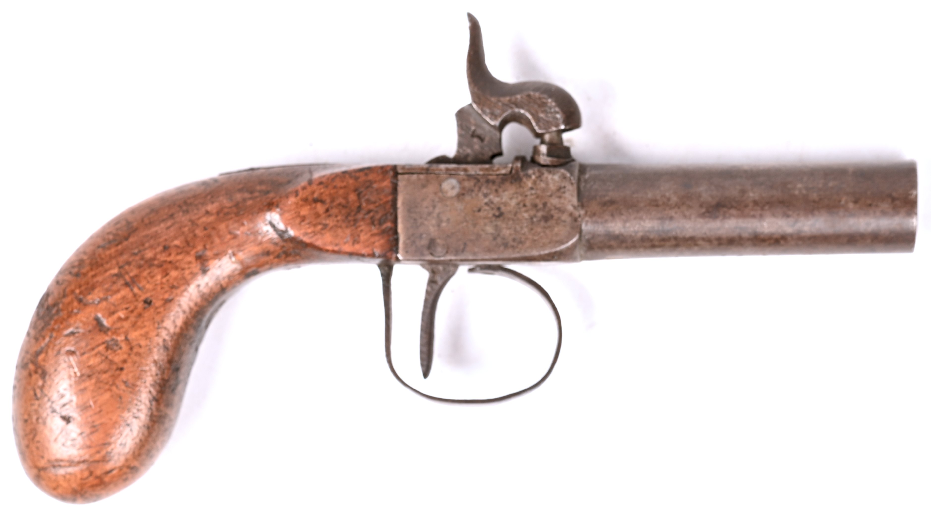 An antique percussion pistol. Marked, with a round barrel measuring 11 mm in inner diameter.