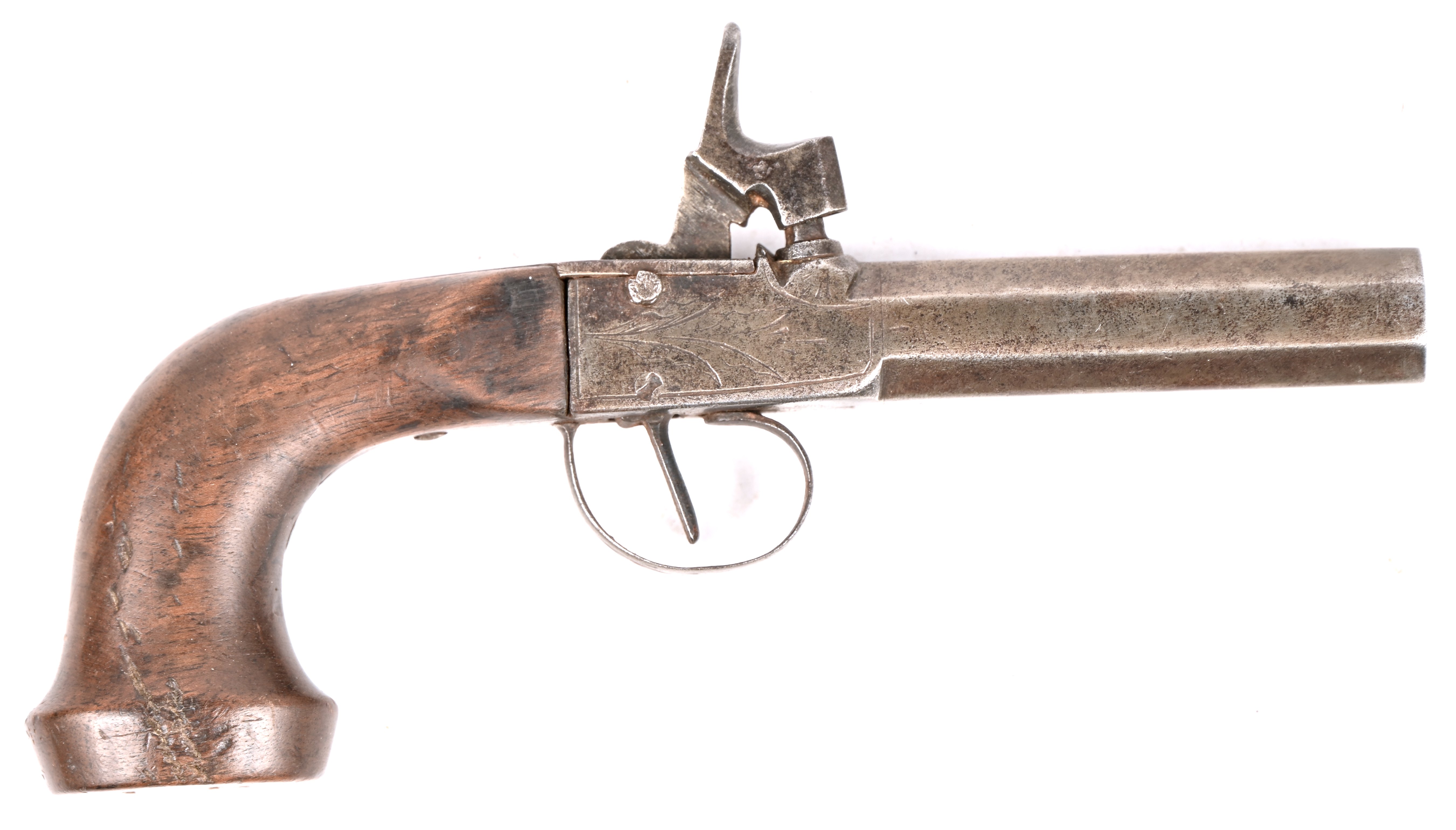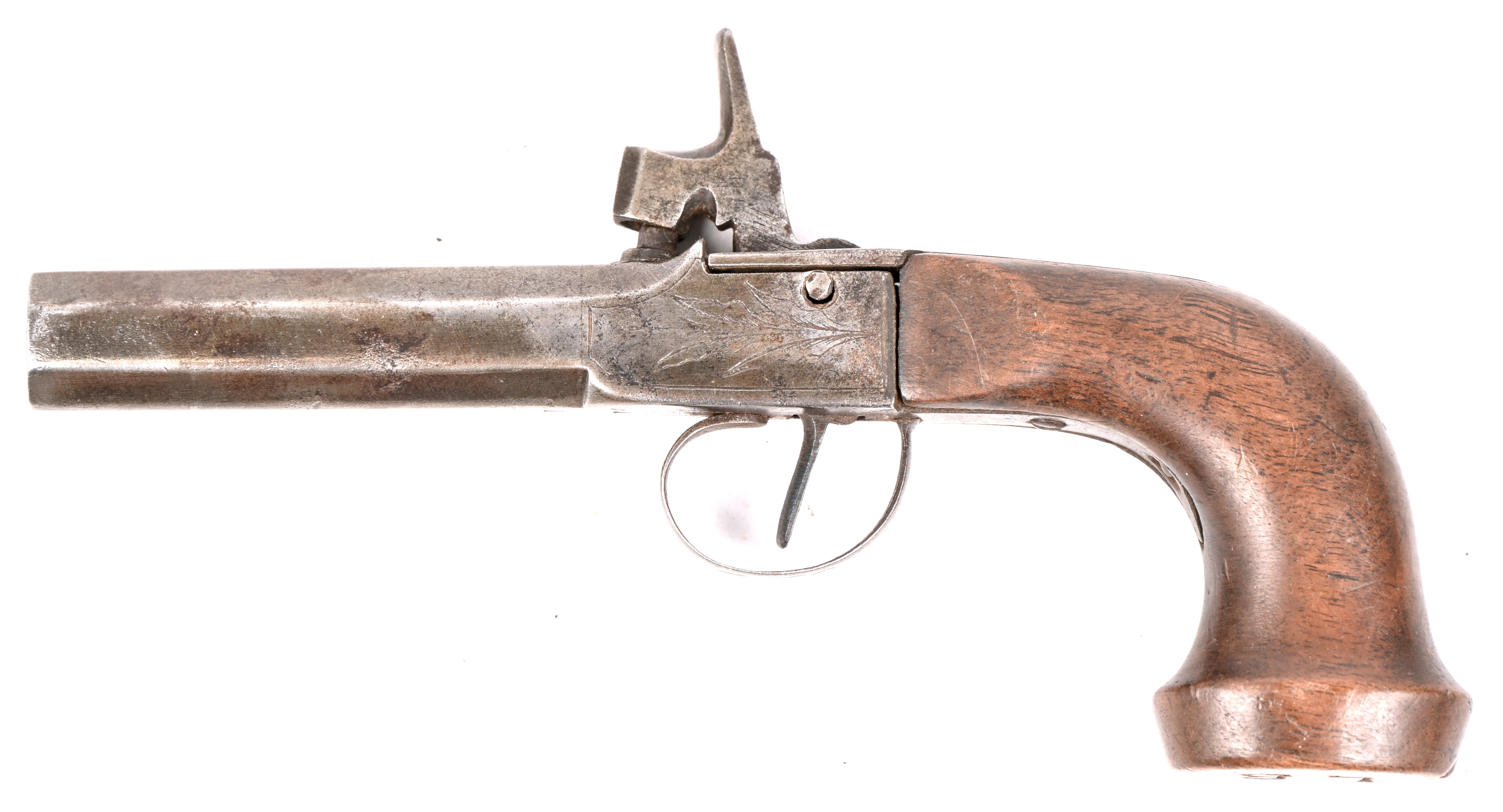 An antique percussion pistol with a wooden stock and engraved metal. Marked '5T', it has an octagonal barrel with an inner diameter of 14 mm.