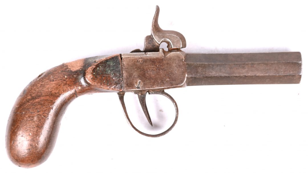 An antique percussion pistol. Unmarked, it has an octagonal barrel with an inner diameter of 11 mm.