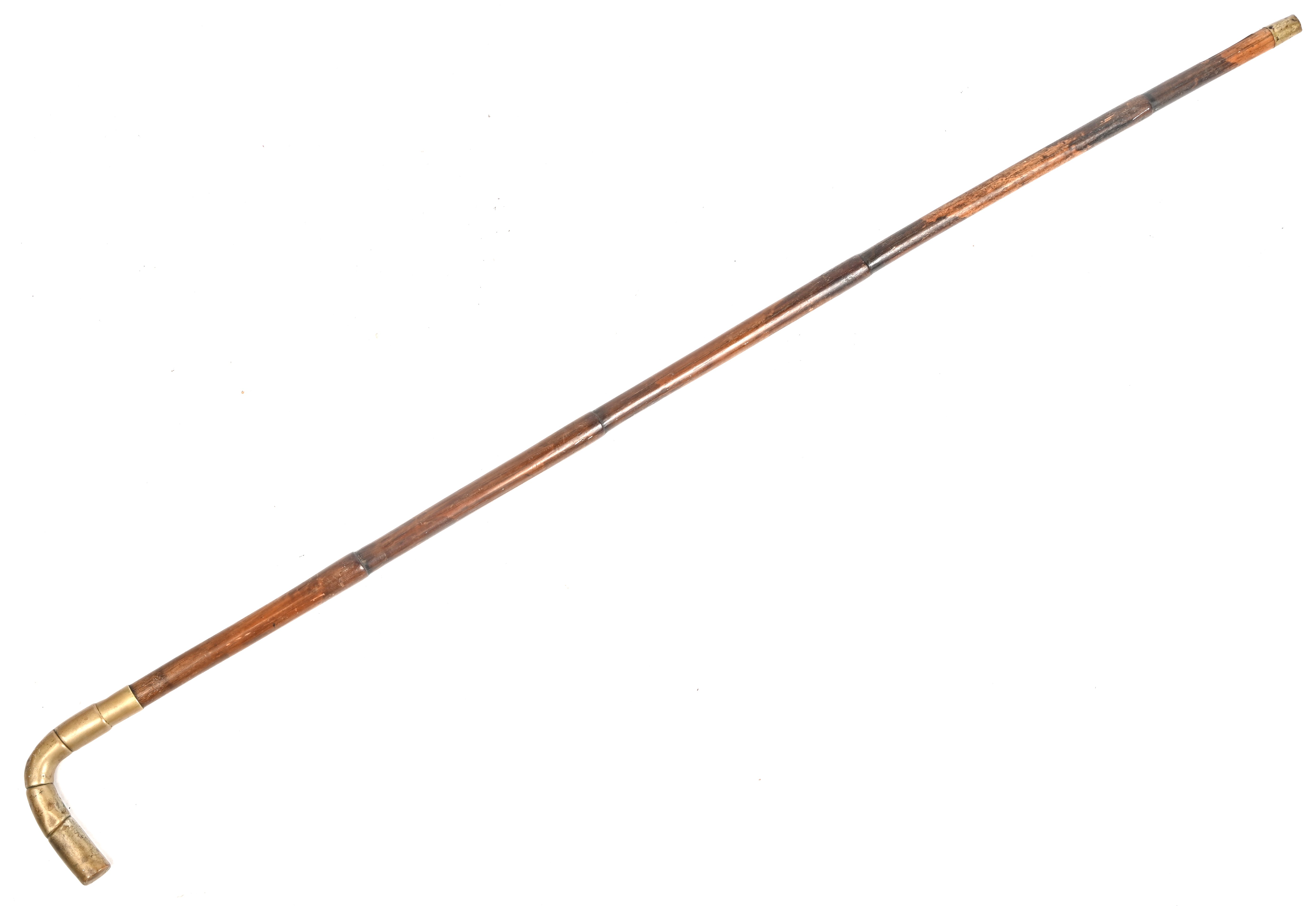 #267Een lot oude wandelstokken met koppen in diverse materialen: leder, hoorn, kunststof (hondekop), toegevoegd een wandelstok met paraplu (schade a/d stof) en een parasolletje.