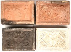 #193Een lot van 4 antieke haardstenen, 3 uit gebakken klei en 1 plaasteren, diverse motieven.