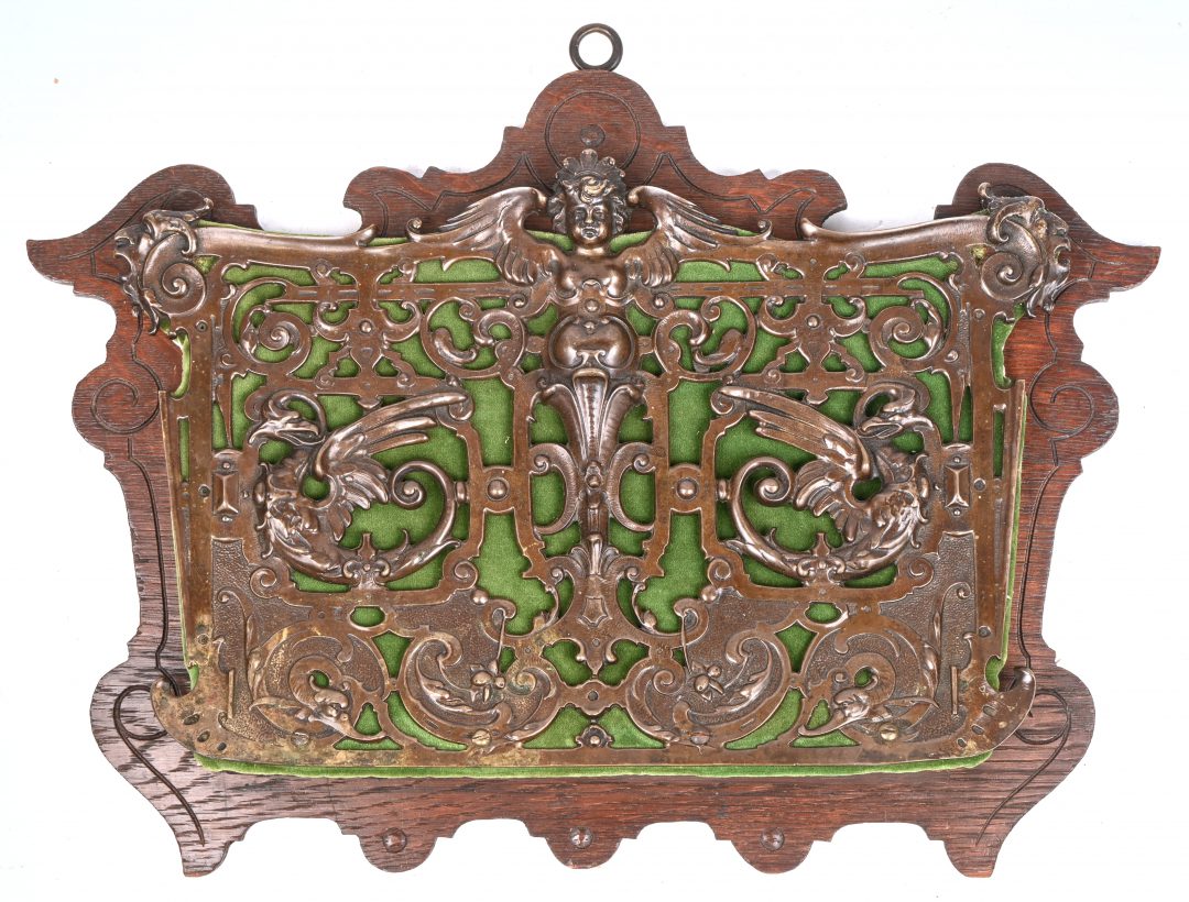 Een antieke krantenhouder, eik en koper.