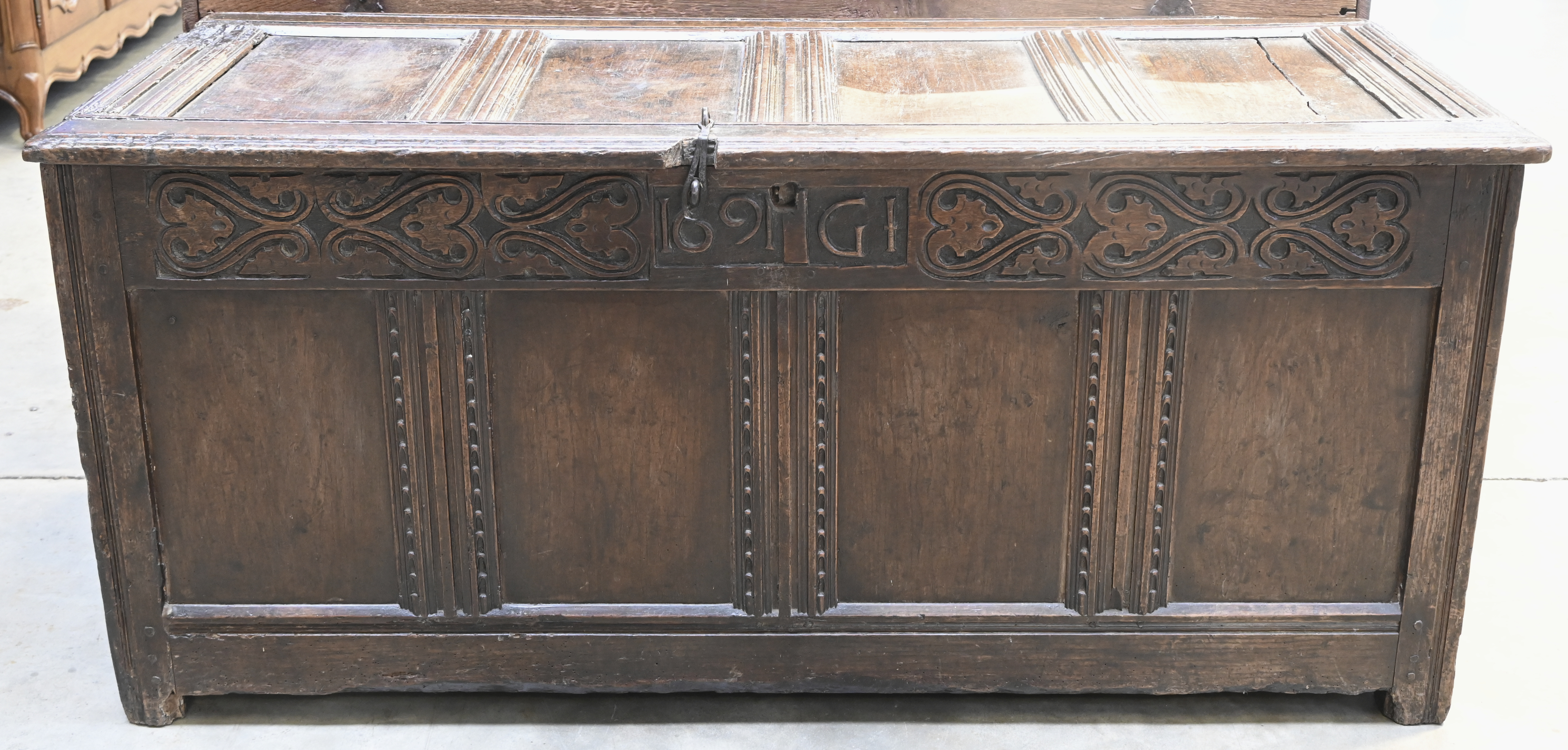 Een antieke massief eikenhouten koffer met snijwerk waarvan ‘1691 - GI’.