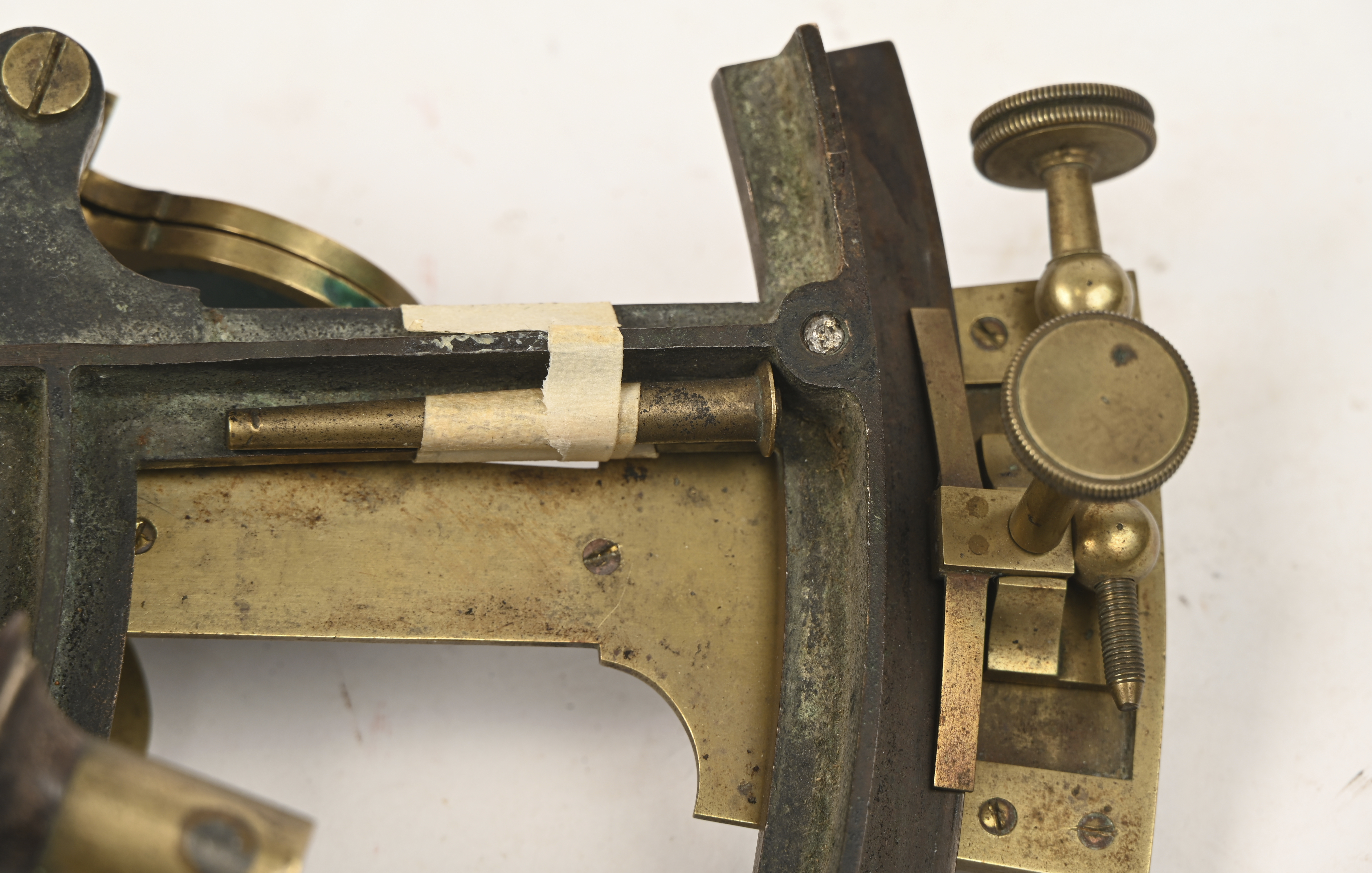 #215Een koperen kruitbus waarvan de verdeelkop ontbreekt, James Dixon & sons.