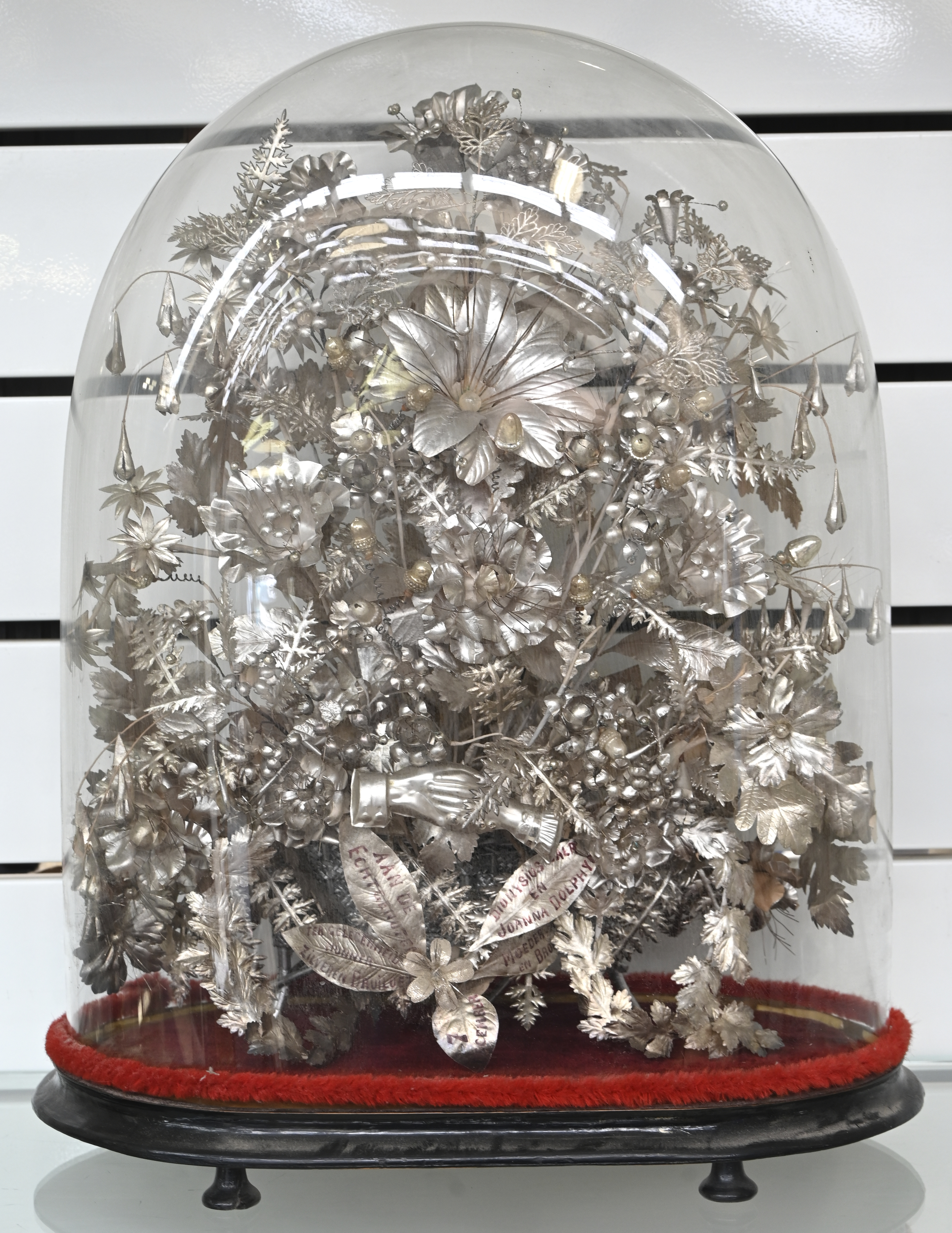 Een antieke stolp met zilverkleurige bloemen ter gelegenheid van een zilveren bruiloft.