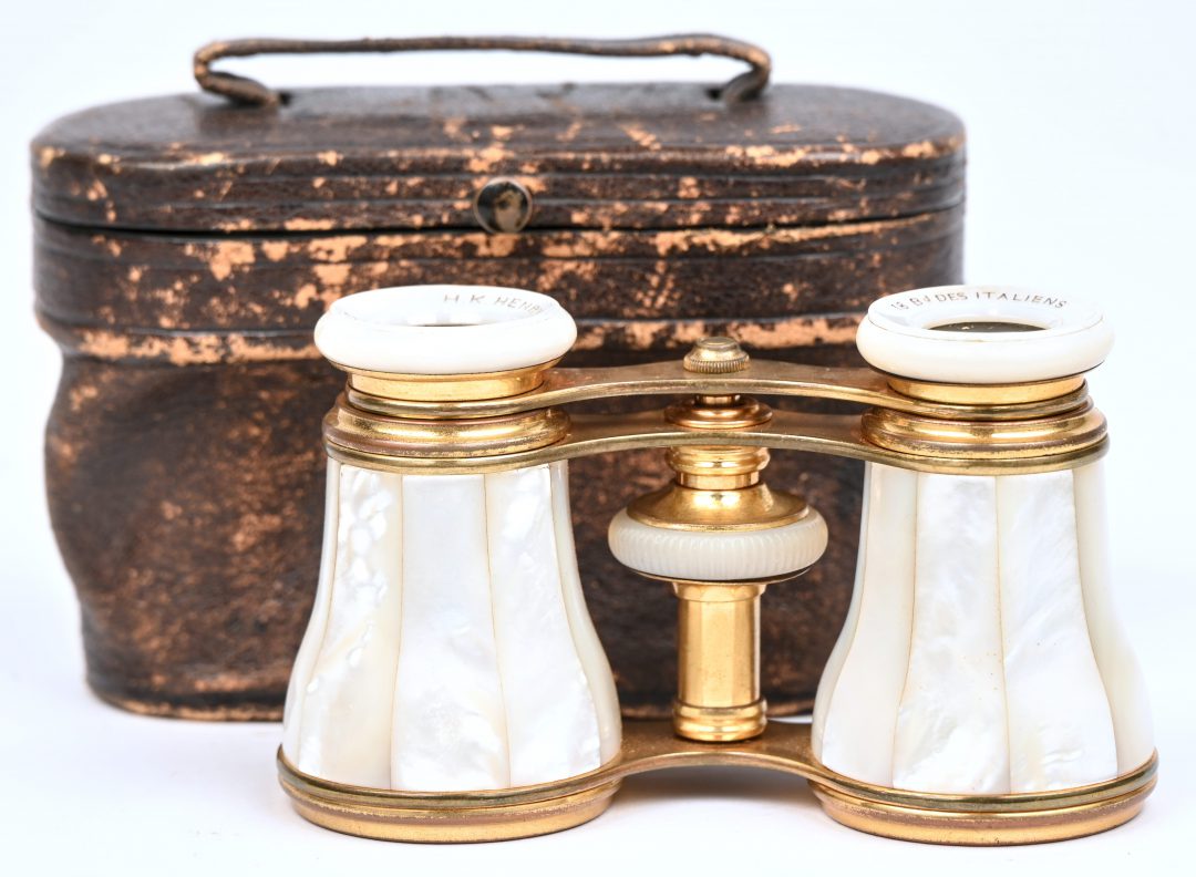 An antique theater viewer, mother of pearl and brass, marked H.K. Henry - Optician - Paris. In leather protective case.