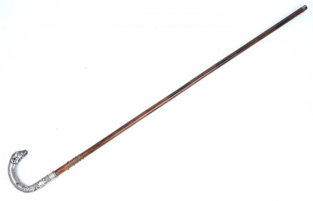 Een antieke wandelstok met zilveren kop, Duitse keuren, schade aan de hondenbek.