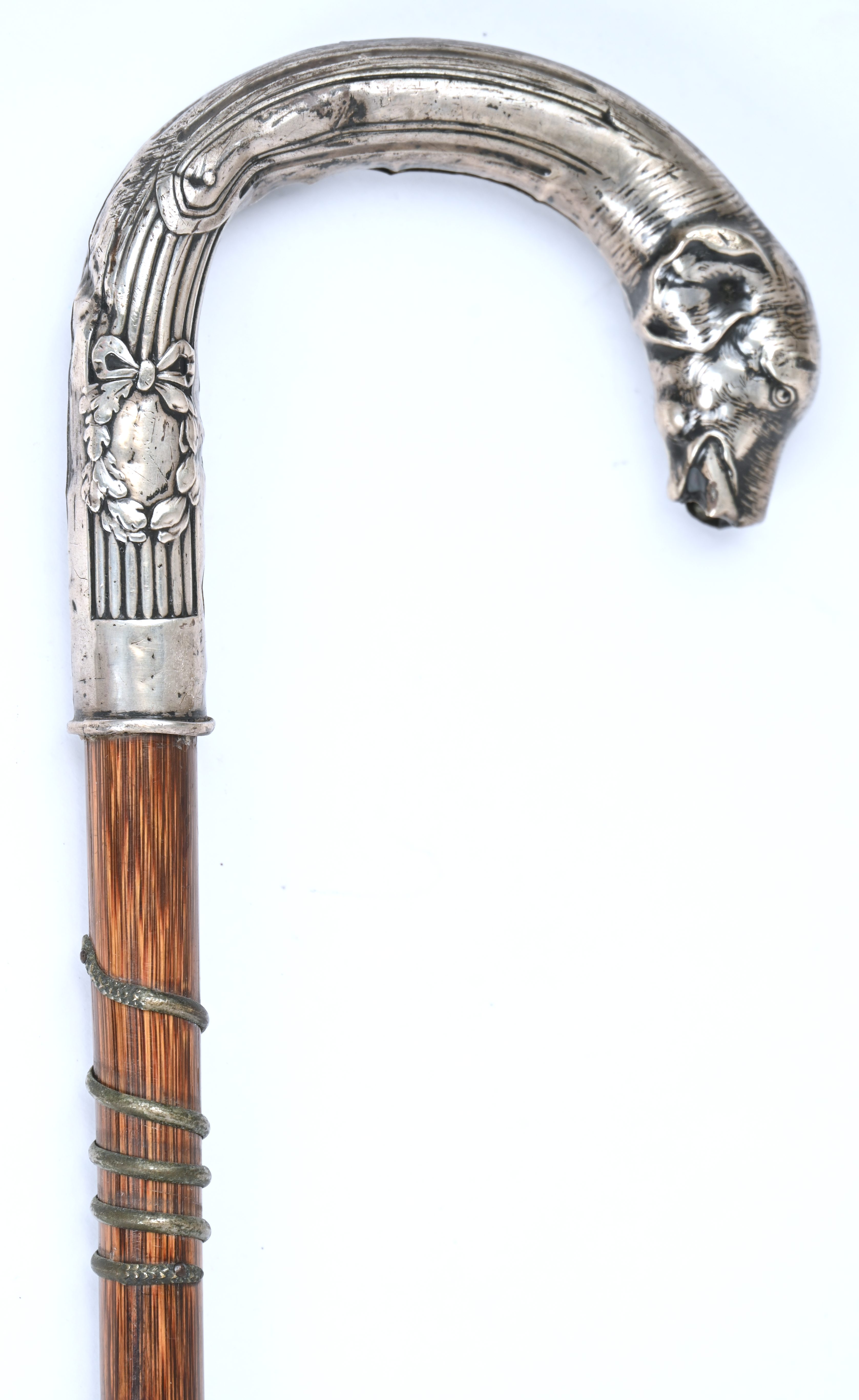 An antique walking stick with a silver handle, German hallmarks, damage to the dog's head.