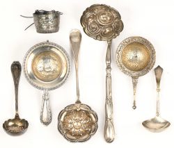 #198Zeven zilveren theezeefjes. Vier gemerkt 800 en drie met Minervahoofdje. Met een gezamelijk brutogewicht van 240 gram.