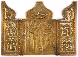 “Trois pères d’église”. Icône de voyage en laiton avec émail bleu.No longer availableDim. 11,5 x 9,5 cmEstimate: € 60/80 -