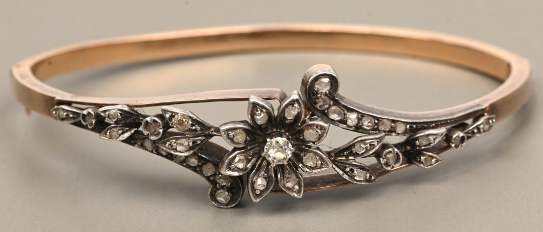 Een armband van 18 kt geelgoud en zilver bezet met diamanten oude slijp met een gezamenlijk gewicht van +- 0,70 ct.