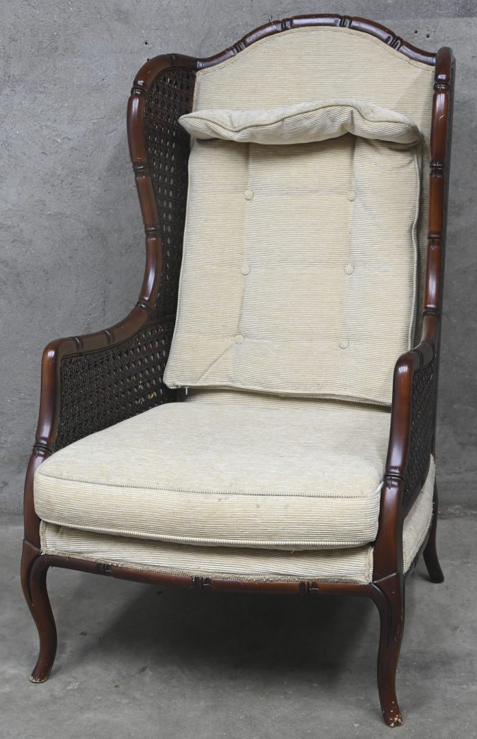 Een armstoel, faux-bamboe en vlechtwerk, beige velours bekleding.
