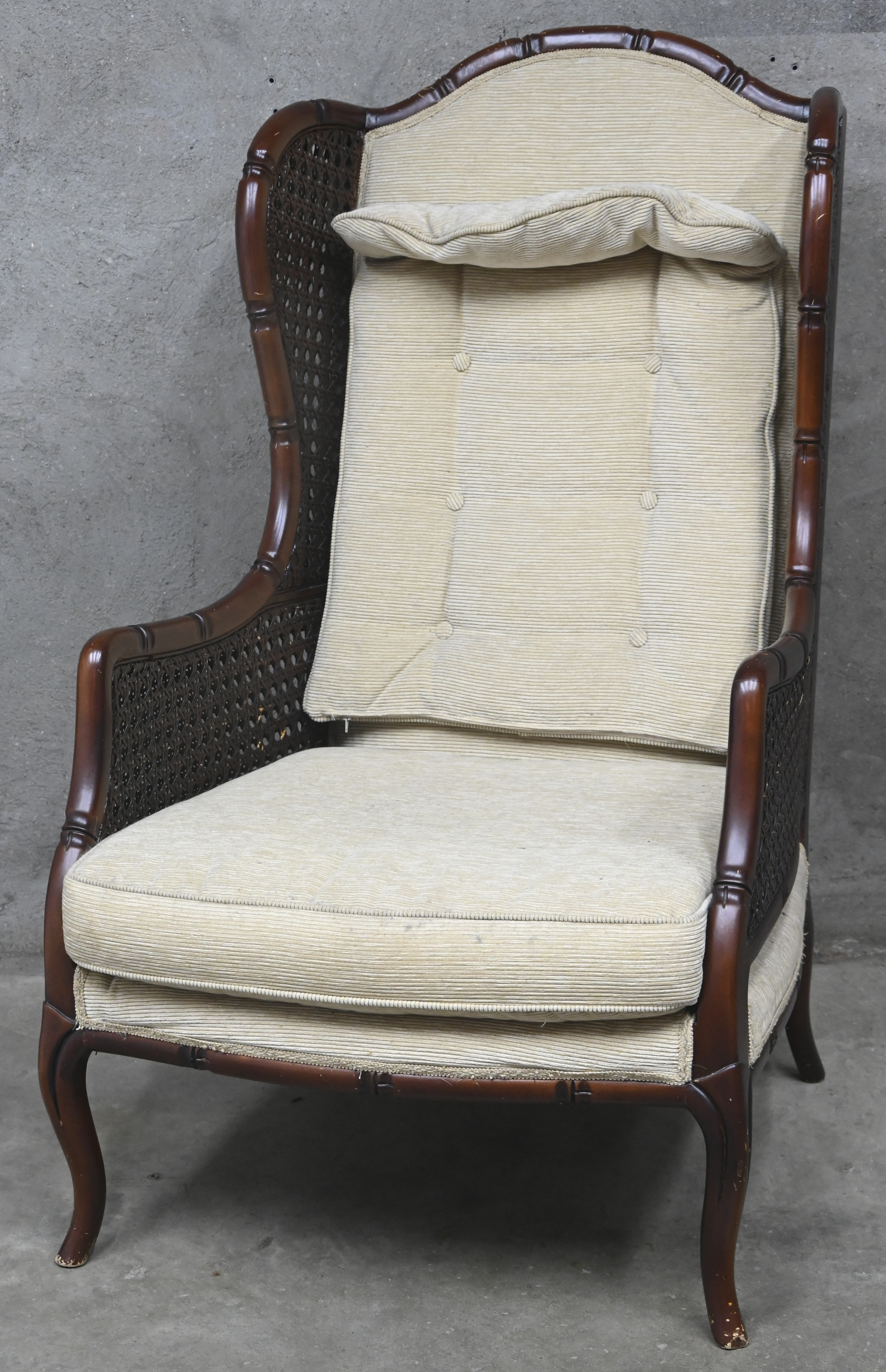 An armchair, faux bamboo and cane, beige velvet upholstery.