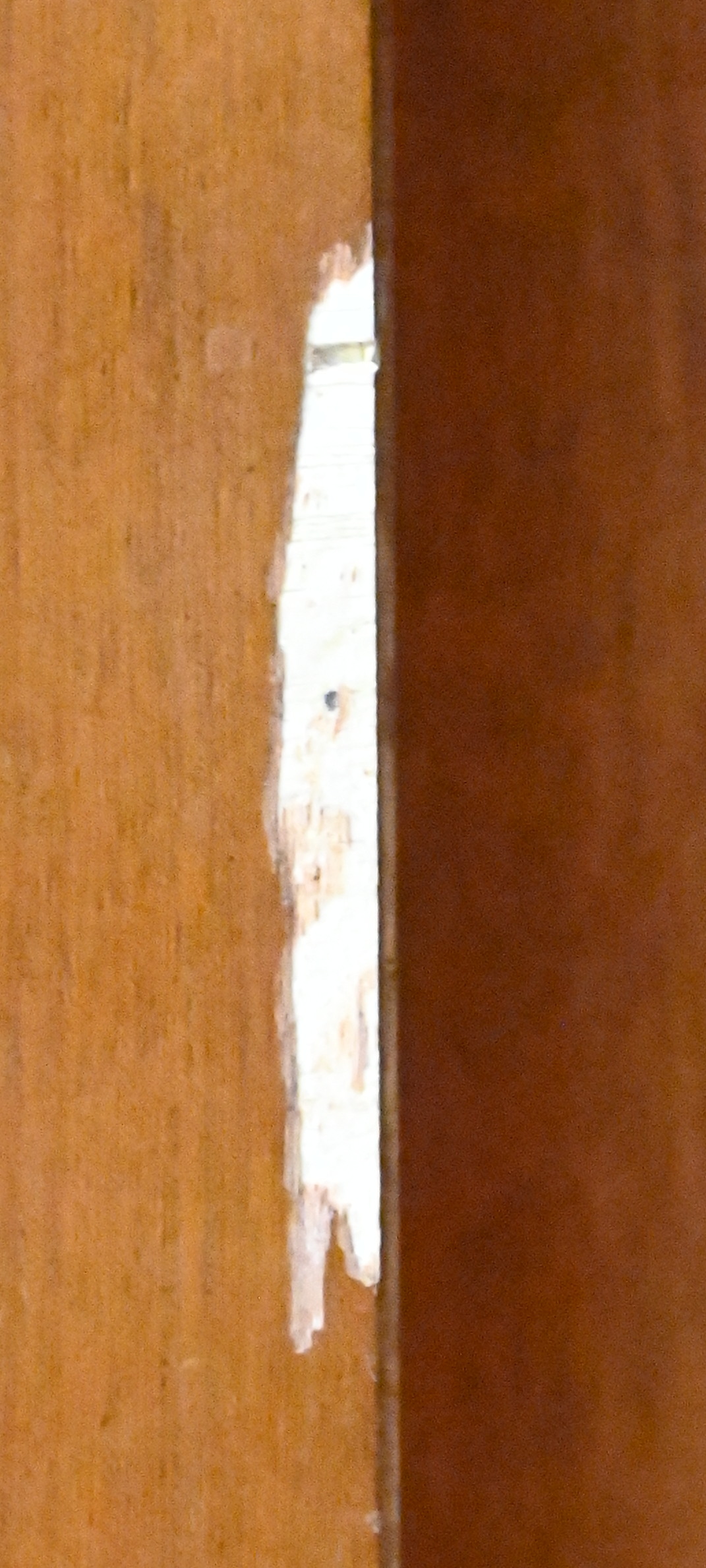 An old tea caddy with curved sides. It has two compartments, the mixing pot is missing. -