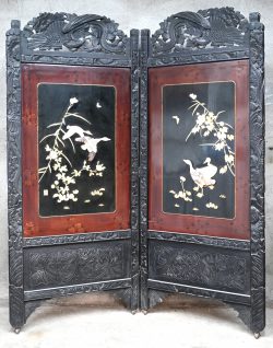 #141Een Aziatisch kamerscherm in twee delen. Van gesculpteerd hout, met planten en ganzen in hoogrelief. Meerdere kleine beschadigingen aan het reliëf.