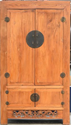 #186Een sobere legkast in Chinese stijl met vier deuren. Onderaan een gesculpteerde fries met twee draken.