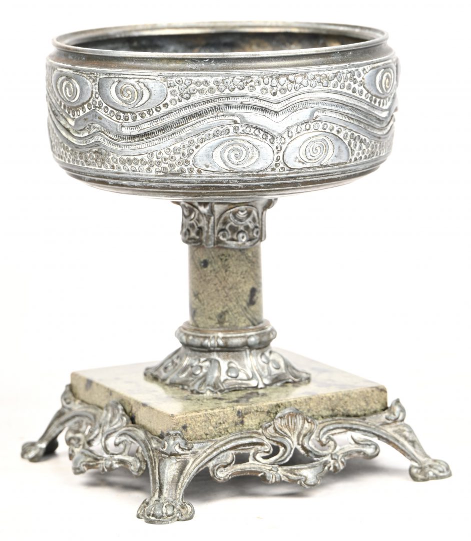 #61Een inktstel met smeedijzeren rozentak in de stijl van Van Boeckel. Op een witte marmeren voet, met twee inktpotten.