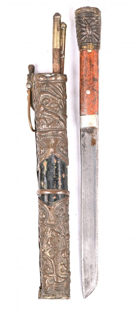 Een Aziatisch mes in een schede van hout versierd met koper. Met een paar eetstokjes als toebehoren.