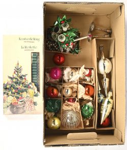#206Een partij vintage kerstdecoratie. Glazen ballen, twee pieken en een beetje varia.