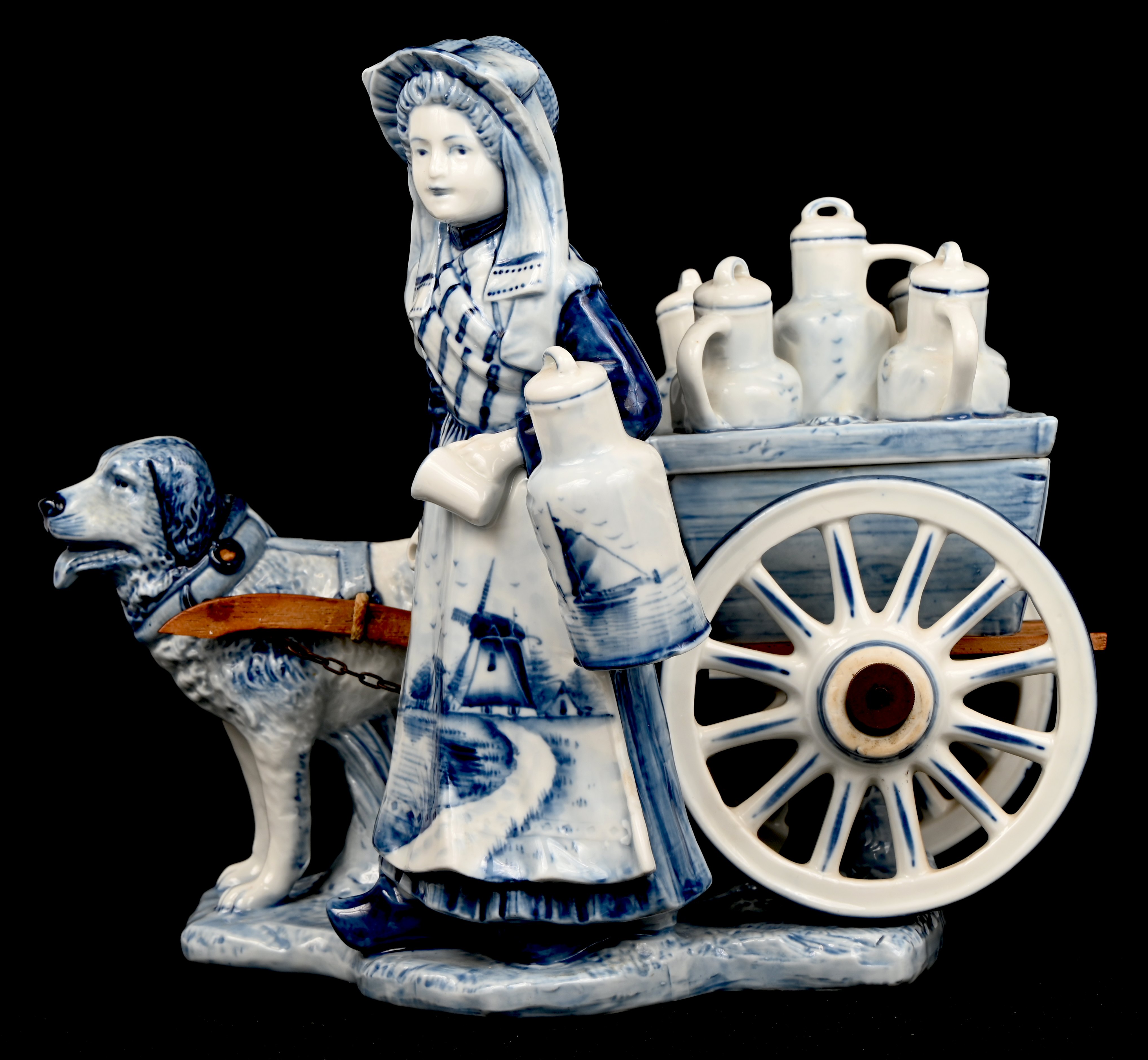 A sculpture of a milkmaid, Delft Blue ceramic.