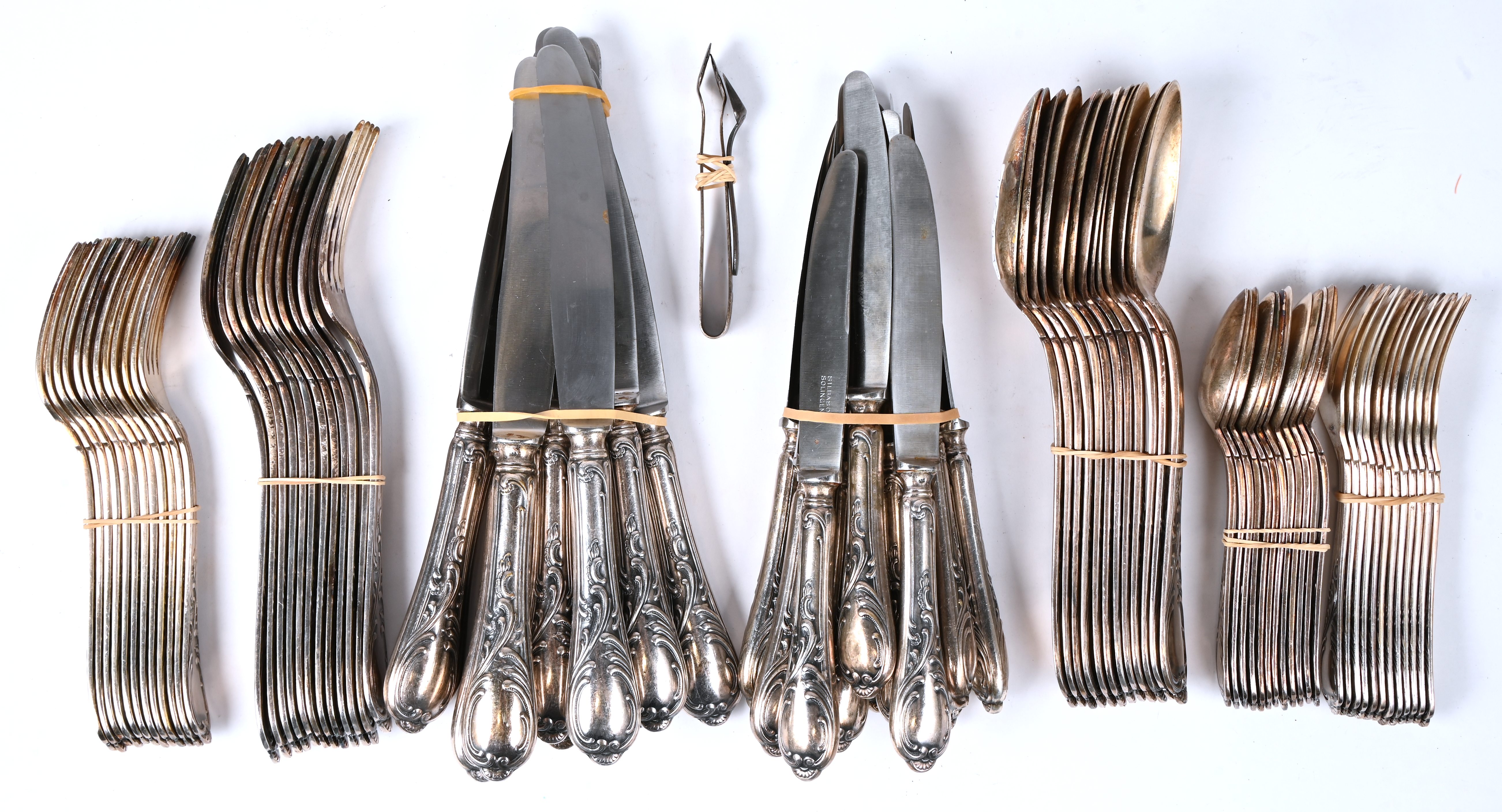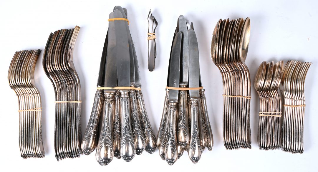 Een bestek voor 12 personen in verzilverd metaal, gemerkt Silbaso Solingen 100, bestaande uit 12 grote vorken, 12 kleine vorken, 12 visvorken, 12 grote lepels, 12 koffielepels, 11 grote messen en 12 kleine messen. Toegevoegd een suikertang en zoutlepeltje.