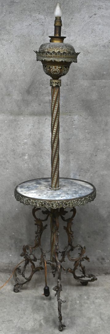 Een bijzettafeltje/tafellamp, gesmeed koper en marmeren blaadje