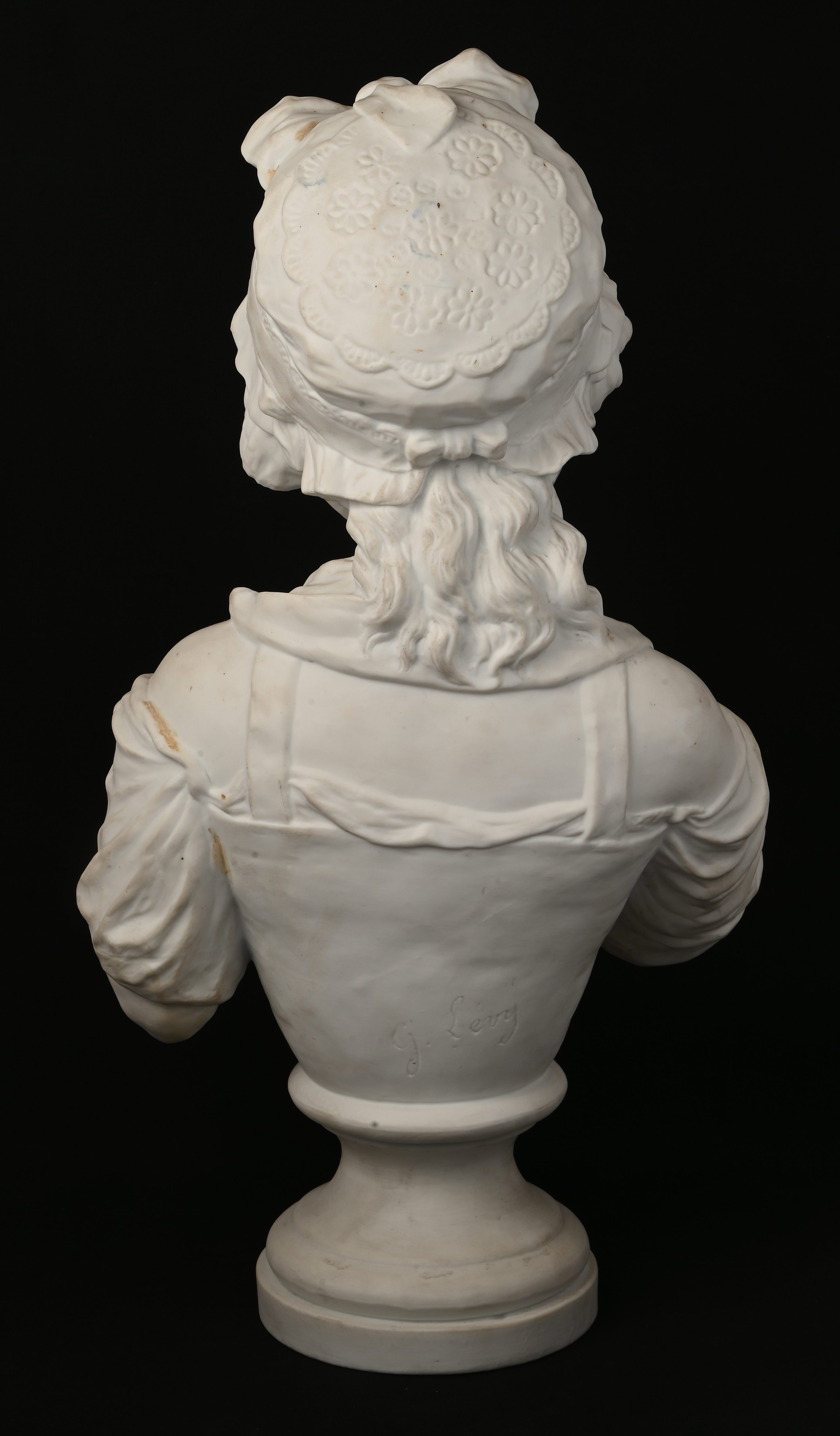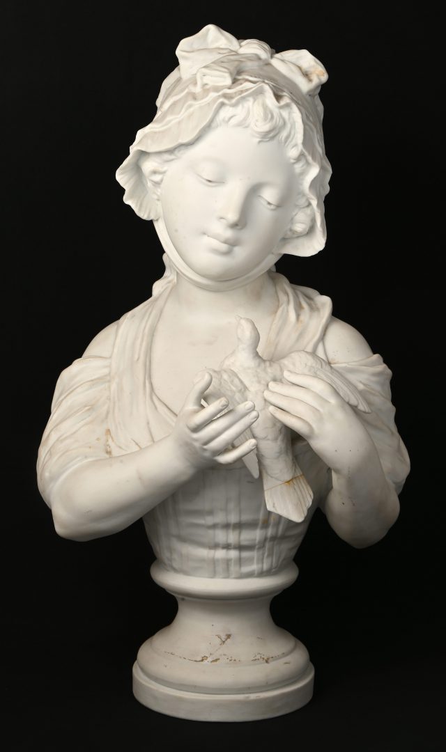 A biscuit bust of a young girl with a bird, signed G. Levy on the back. Glued to the bird's tail.