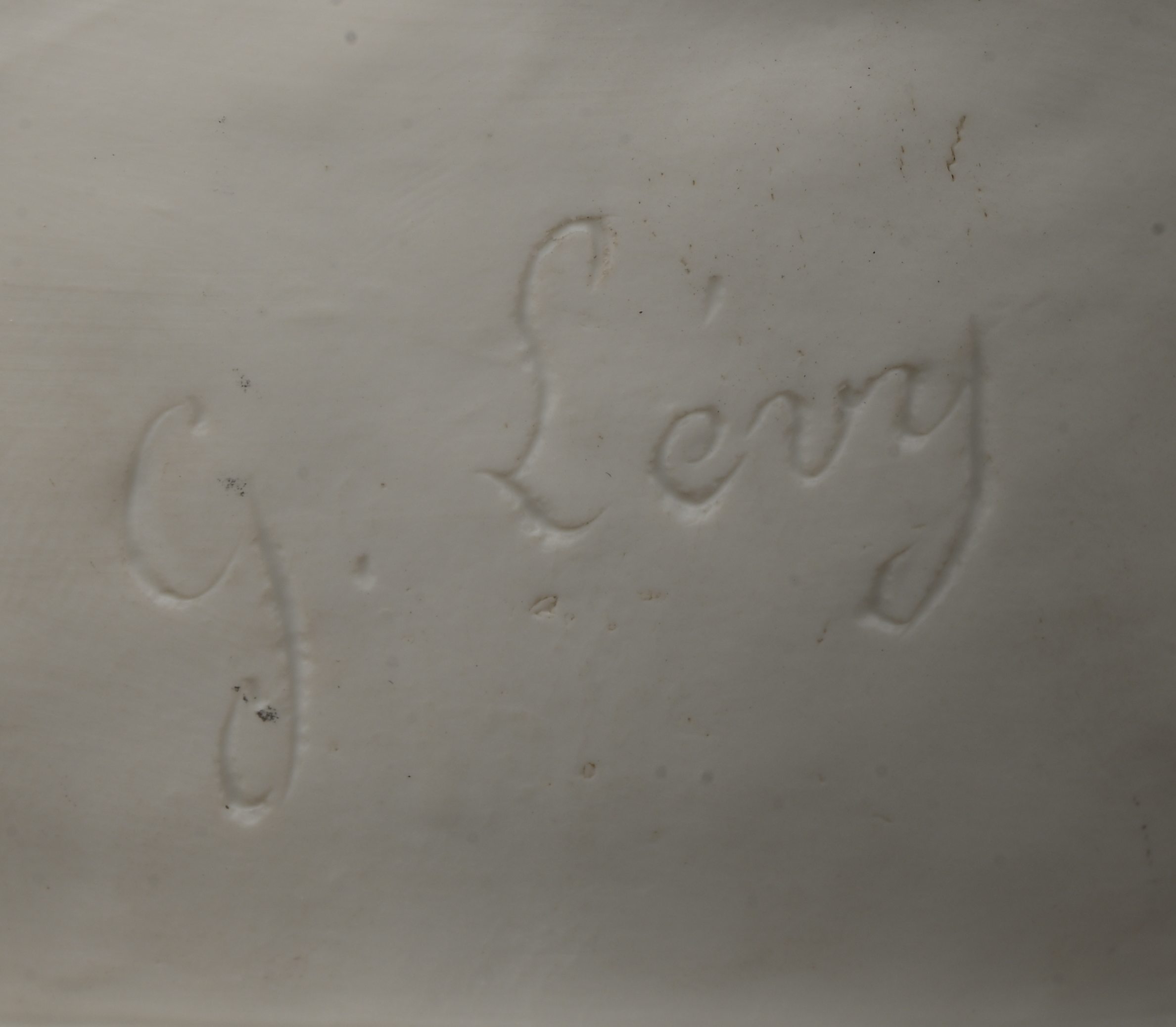 Een biscuit buste van een jong meisje met vogel, achteraan gesigneerd G. Levy. Gelijmd aan de staart van de vogel.