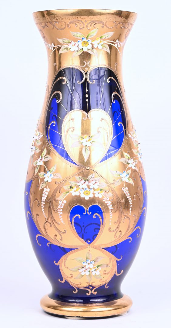 Een blauw glazen vaas, Egermann Bohemia, met goudkleurige decoratie en emaille bloemetjes.