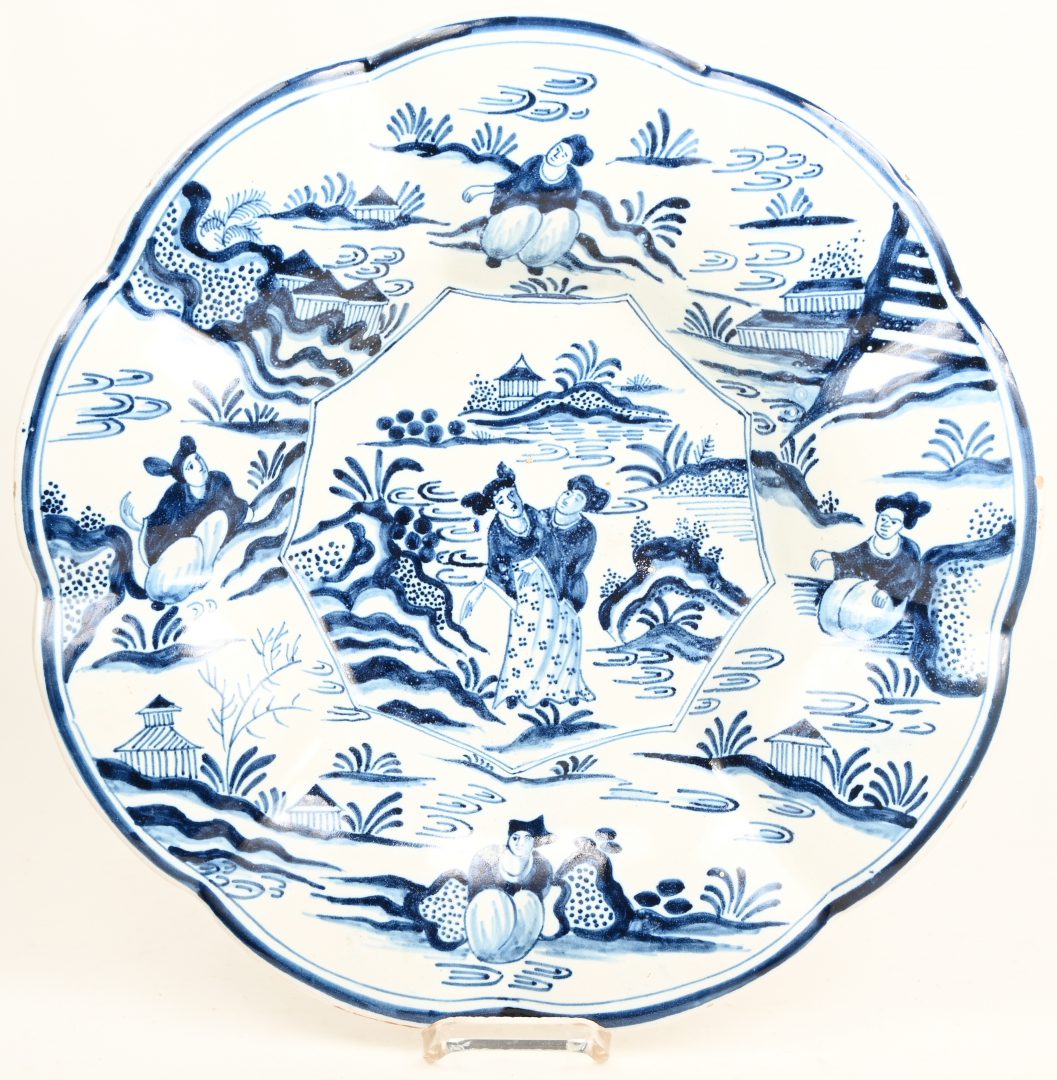 Een blauw-wit Delfts aardewerken plooischotel met diverse figuren en landschap in het decor.