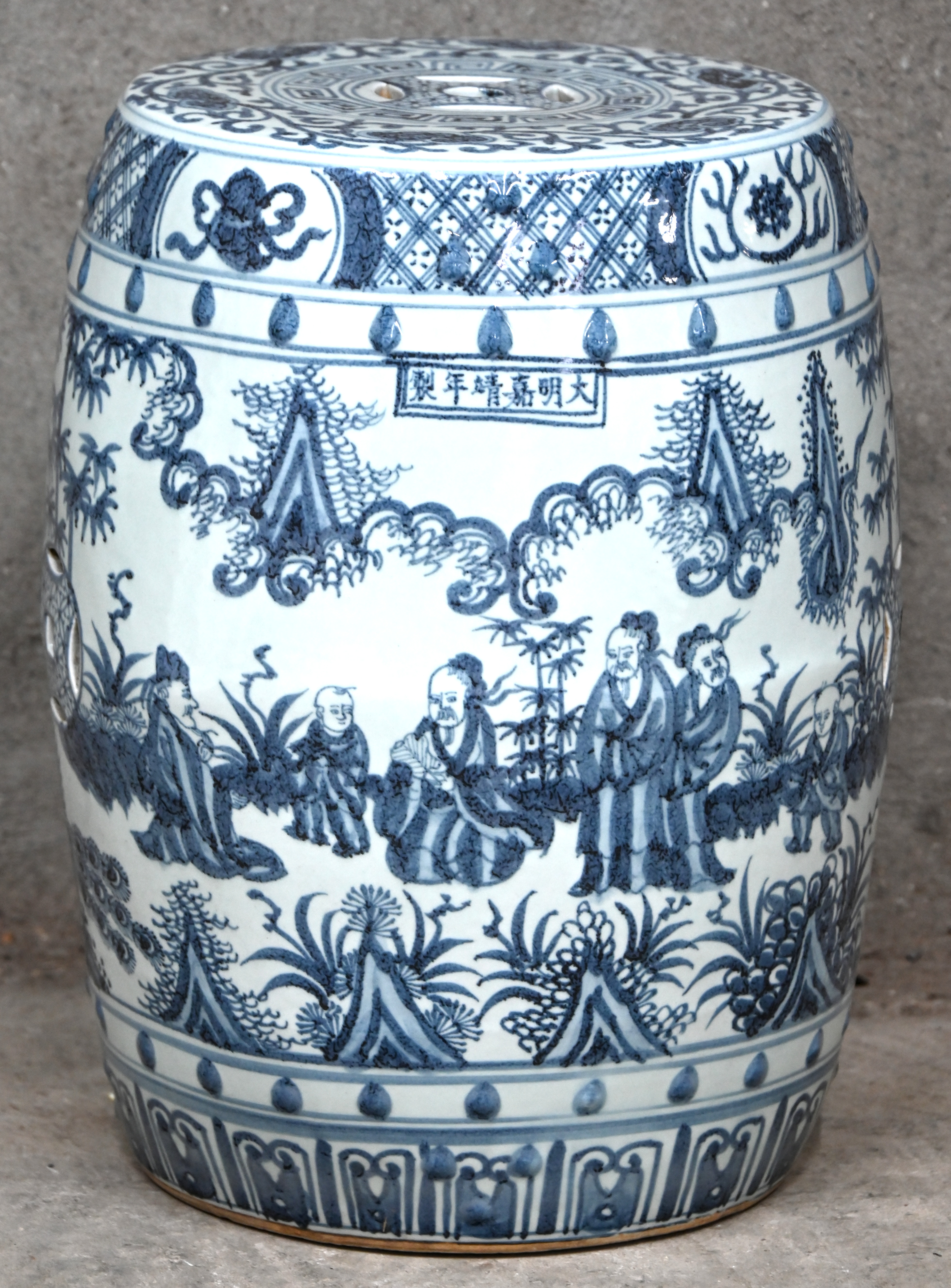 Een ronde Chinese houten salontafel met een landschap en vogel gedecoreerd.