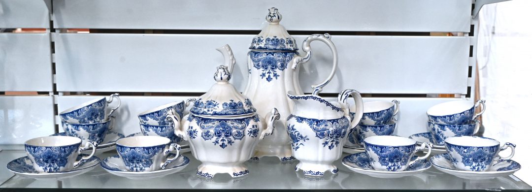 #321Declercq Fuisseaux BaudourEen koffie en theeservies van meerkleurig porselein. Met een decor van bloemen en insecten. Gemerkt DFB.