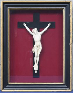 #64Een kruisbeeld, eerste helft 20ste eeuw, keramische Christus aan houten kruis in kader met rode vilt.