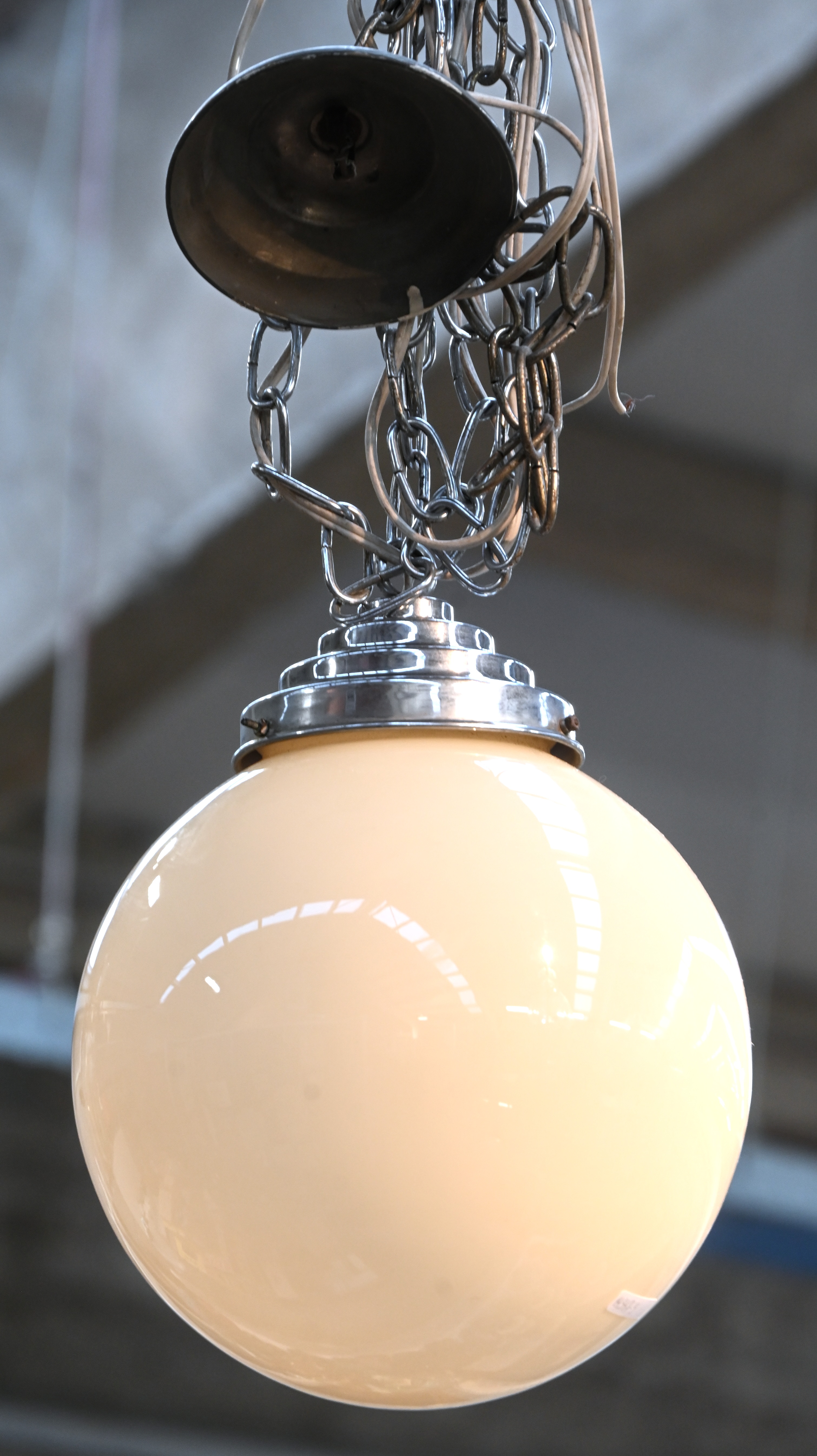 A table lamp shaped like a candelabra with three arms. Made of molded glass, damage to one of the opaline 'candles'. -
