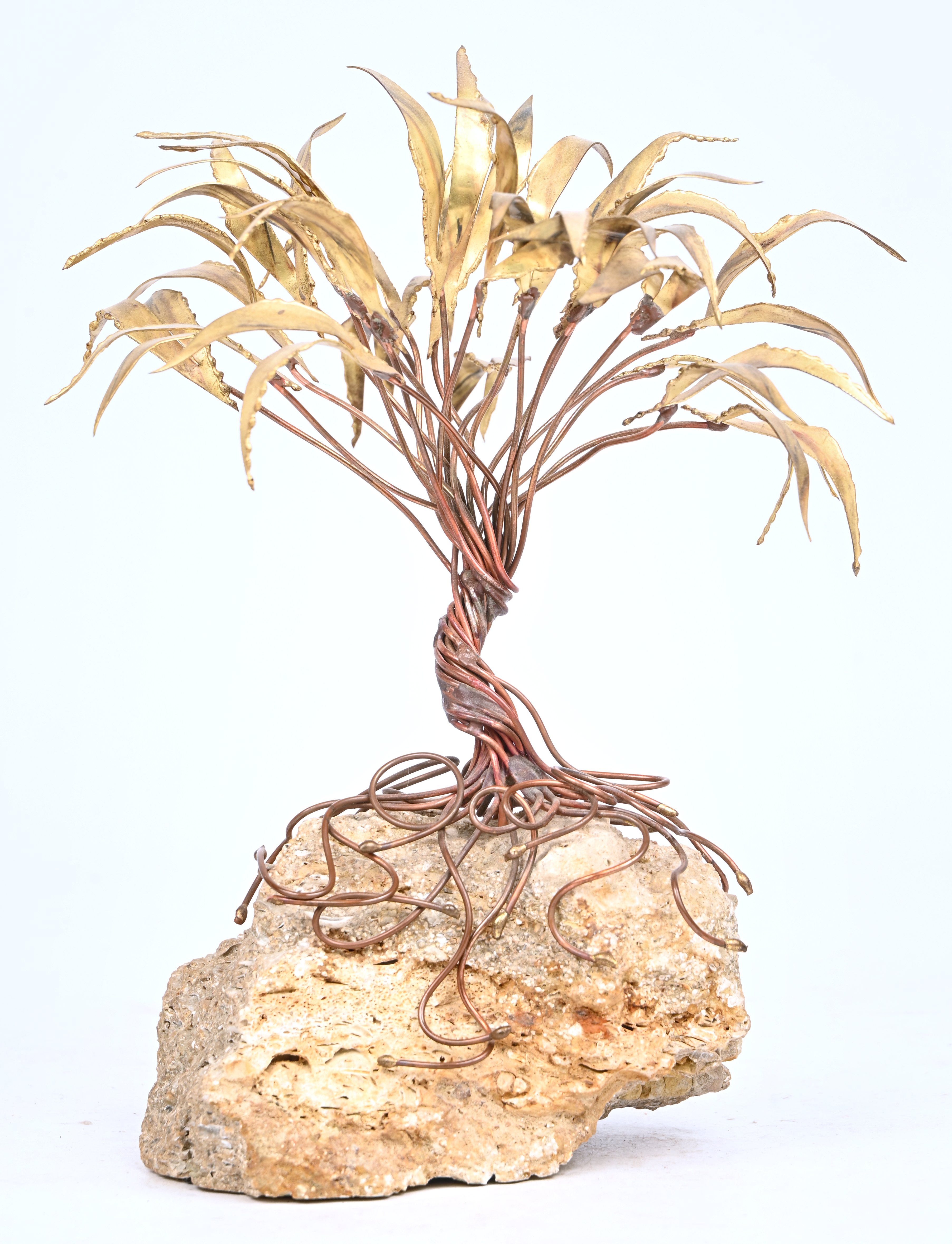An antique wooden walking stick with a copper handle.