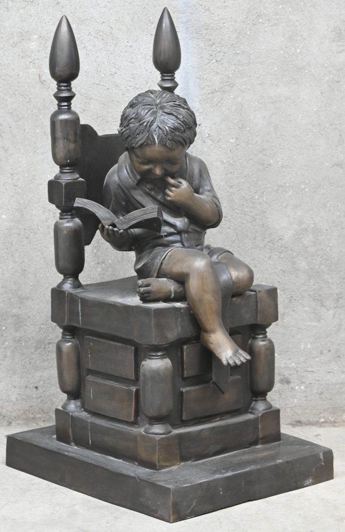 Een bronskleurig beeld van een lezende jongen op een stoel.
