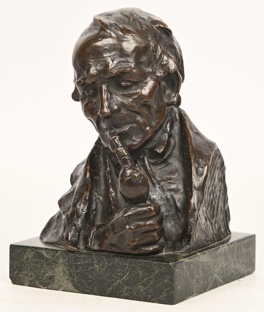 #133Auguste BijaPeriod: 1872 - 1957Een bronzen buste van een jongedame op groen marmeren sokkel.