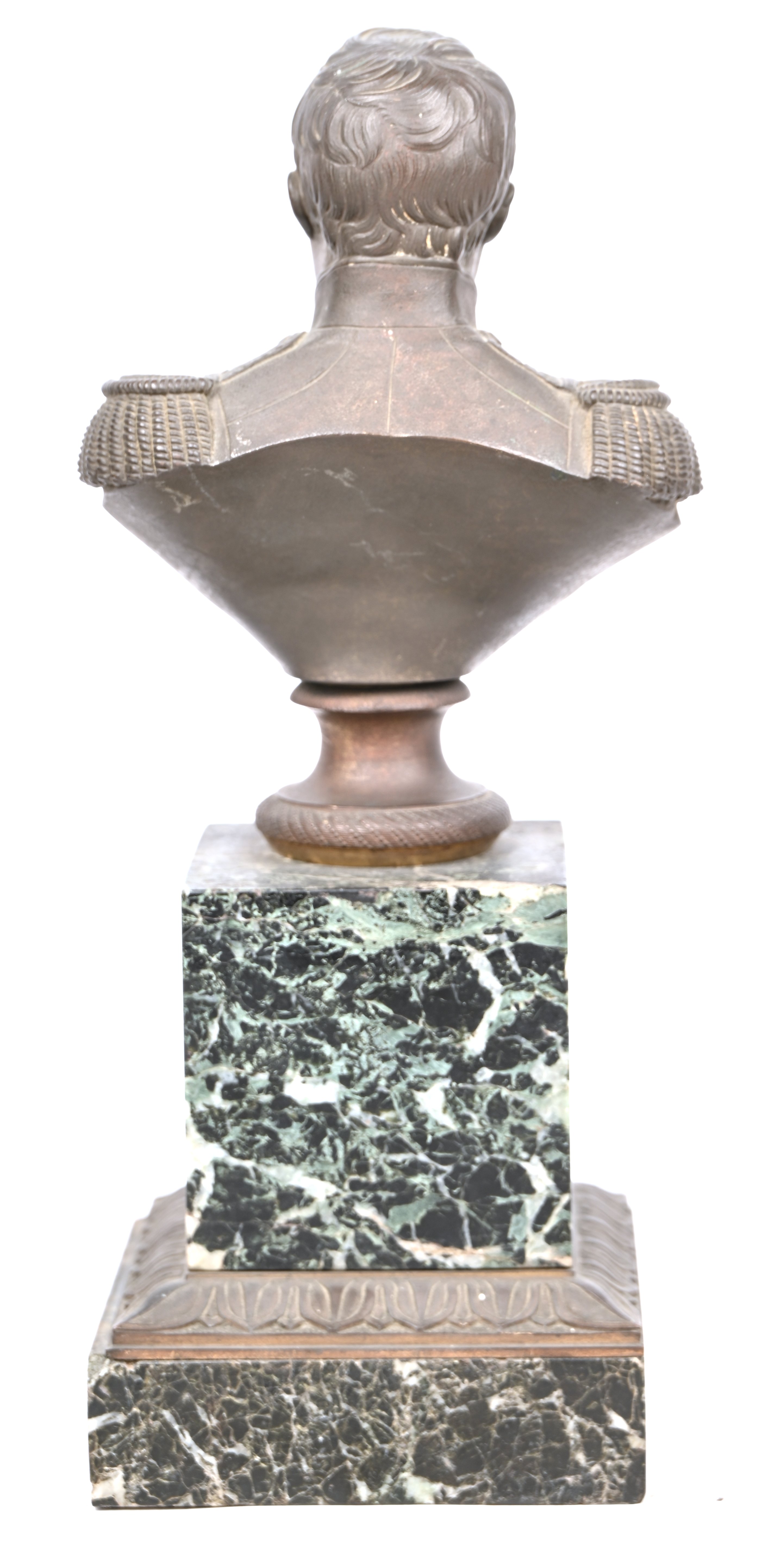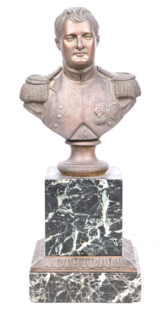 Een bronzen buste van Napoleon Bonaparte op een voet van groen marmer. Met schade aan de basis.