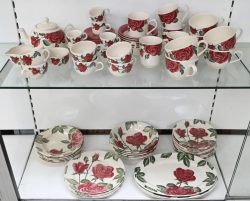 #479Claytan TablewareEen uitgebreid eetservies met decor van rozen. ‘Made in Malaysia’. Thee & koffie servies met suiker en melkpot voor 6 personen. Kleine en grote koffietassen en grote theetassen. Zes soepborden, vijf platte borden, dertien dessertborden en drie schotels. 77 stuks.