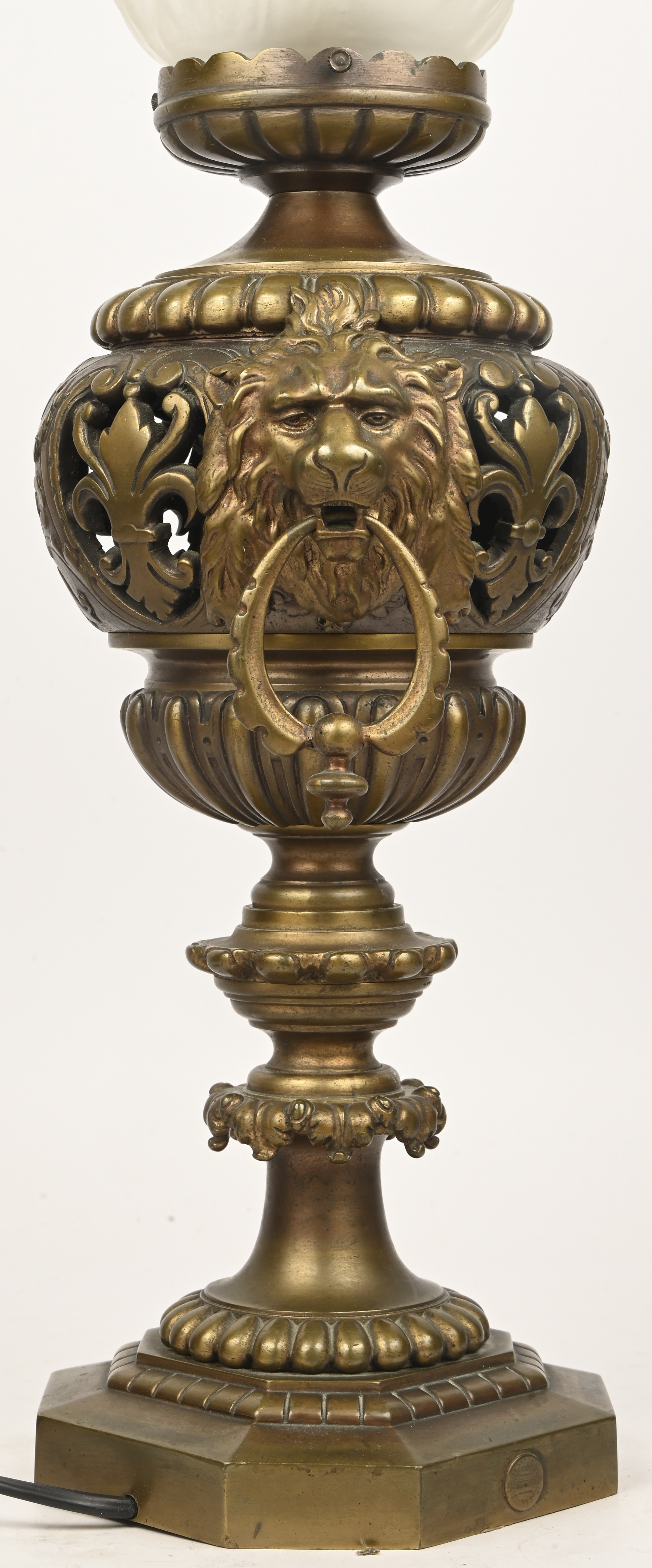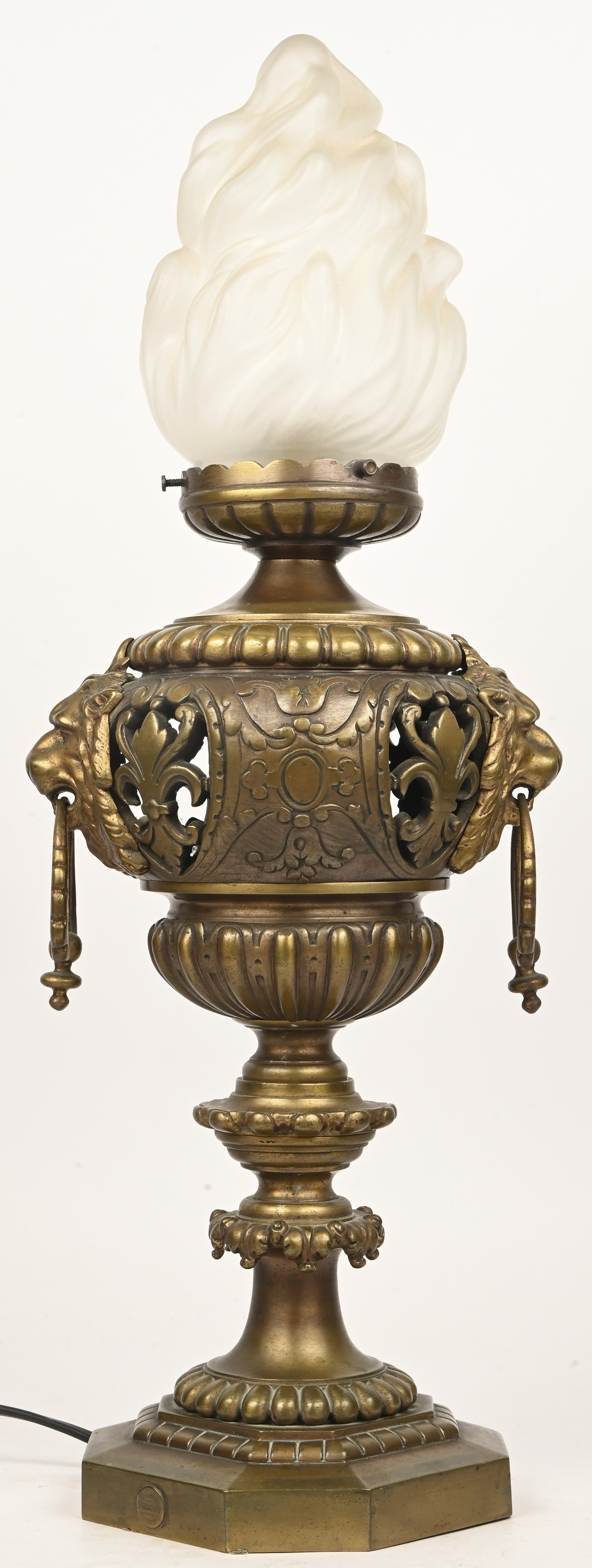 Een bronzen tafellamp met glazen blaker in de vorm van een vlam.