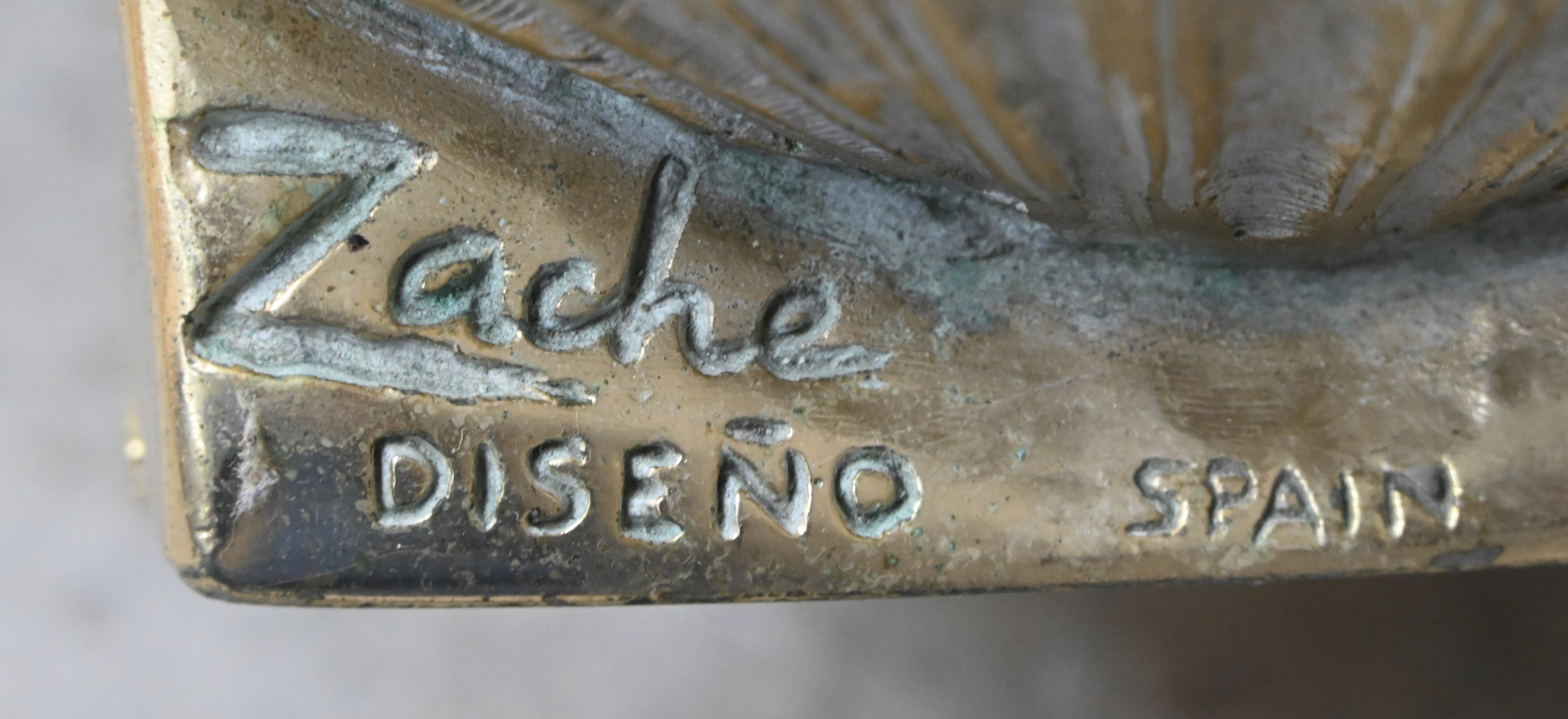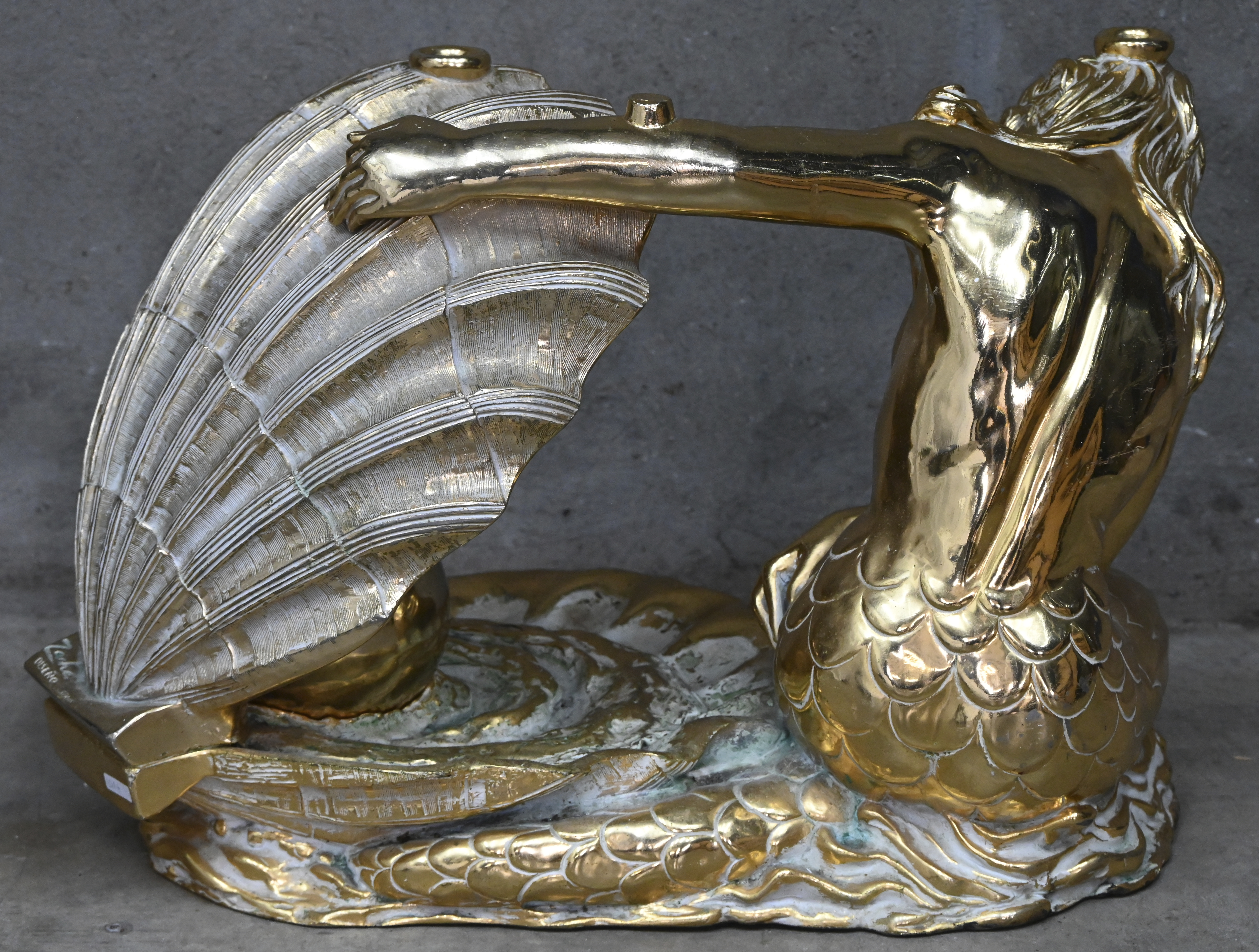‘Zeilboot’, een abstract bronzen beeld op een zwarte marmeren voet. Getekend.